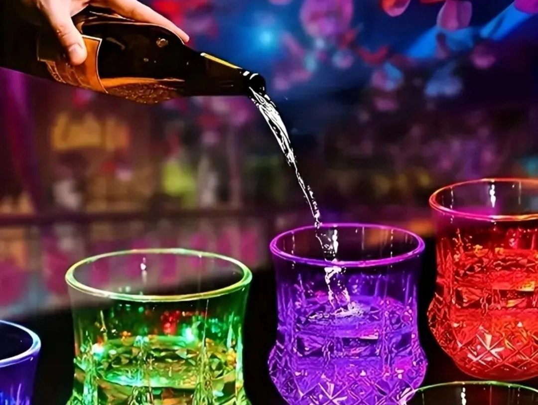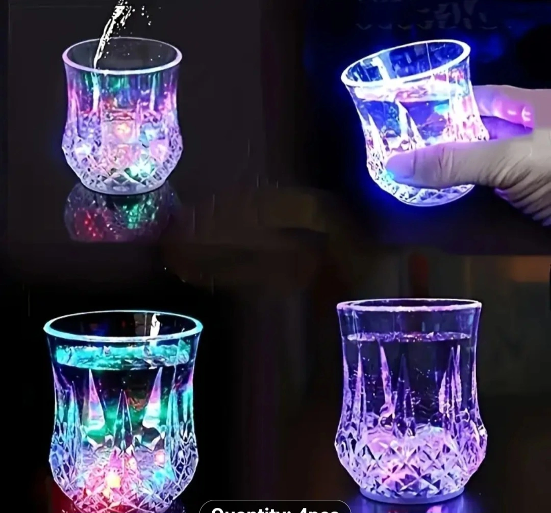 Set of four LED light-up glasses. Perfect for parties or bars. Colour changing lights activate when liquid is added. Approximately 7.2cm diameter and 8.2cm tall.