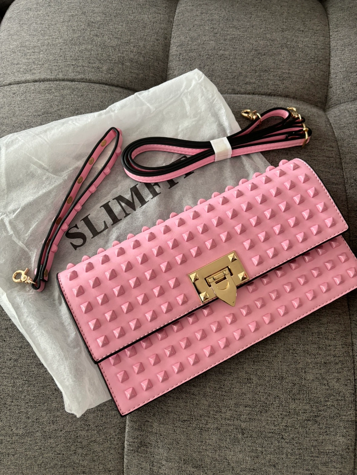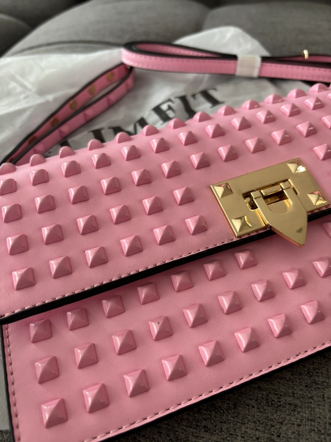 Cute pink crossbody bag. Features gold hardware and a studded design. Includes a removable strap. Small, ideal for evenings out.
