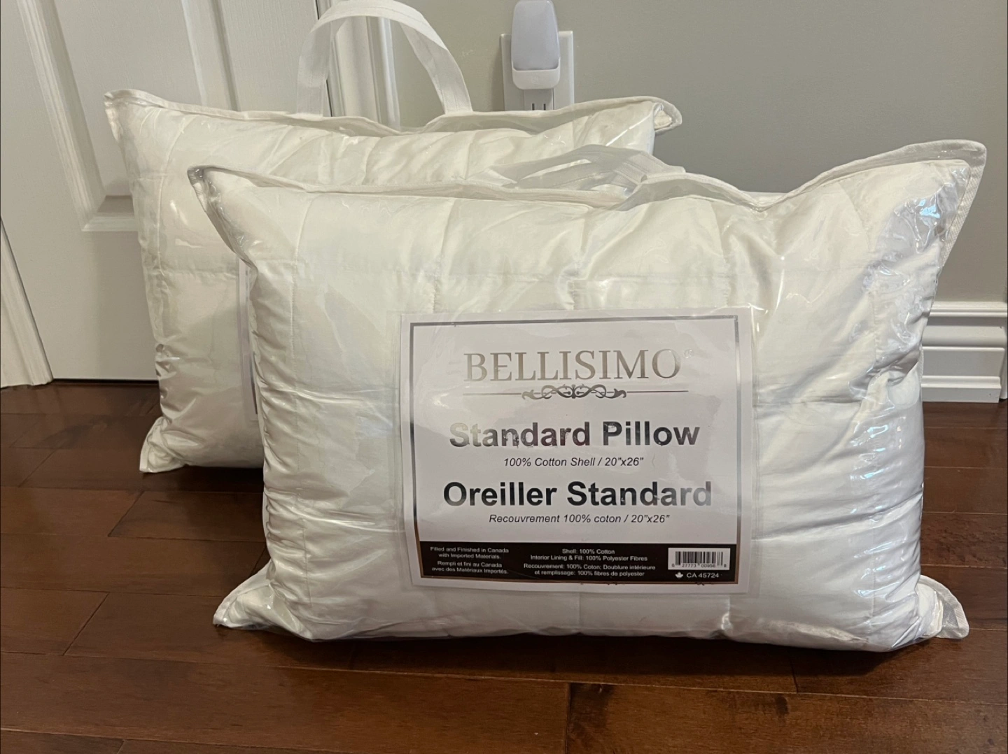 Two new standard pillows. 100% cotton shell. Filled with polyester fibres. Filled and finished in Canada.