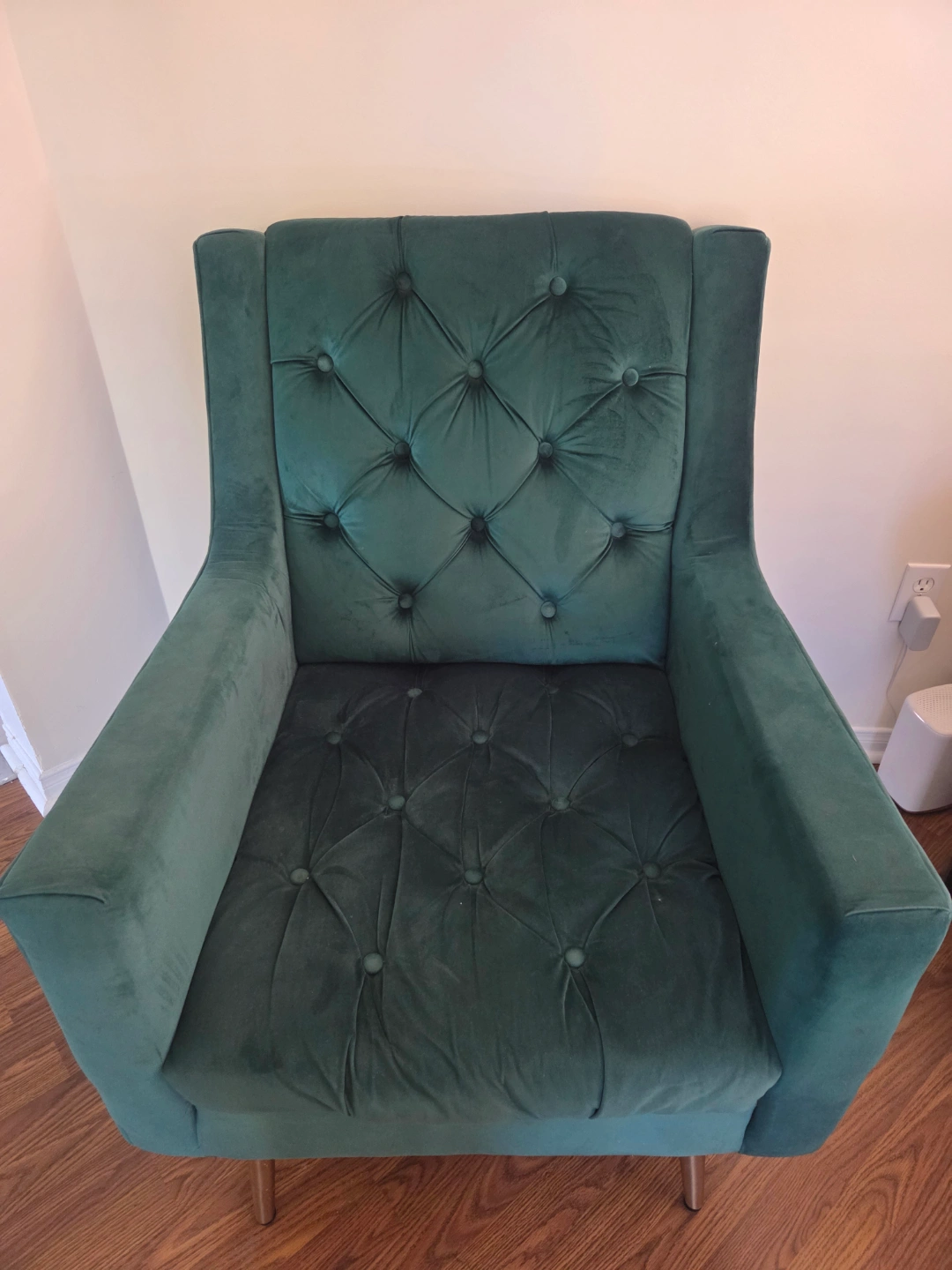 Dark green velvet armchair. Button tufting. Gold legs. Stylish and comfortable. Perfect for living room or bedroom.