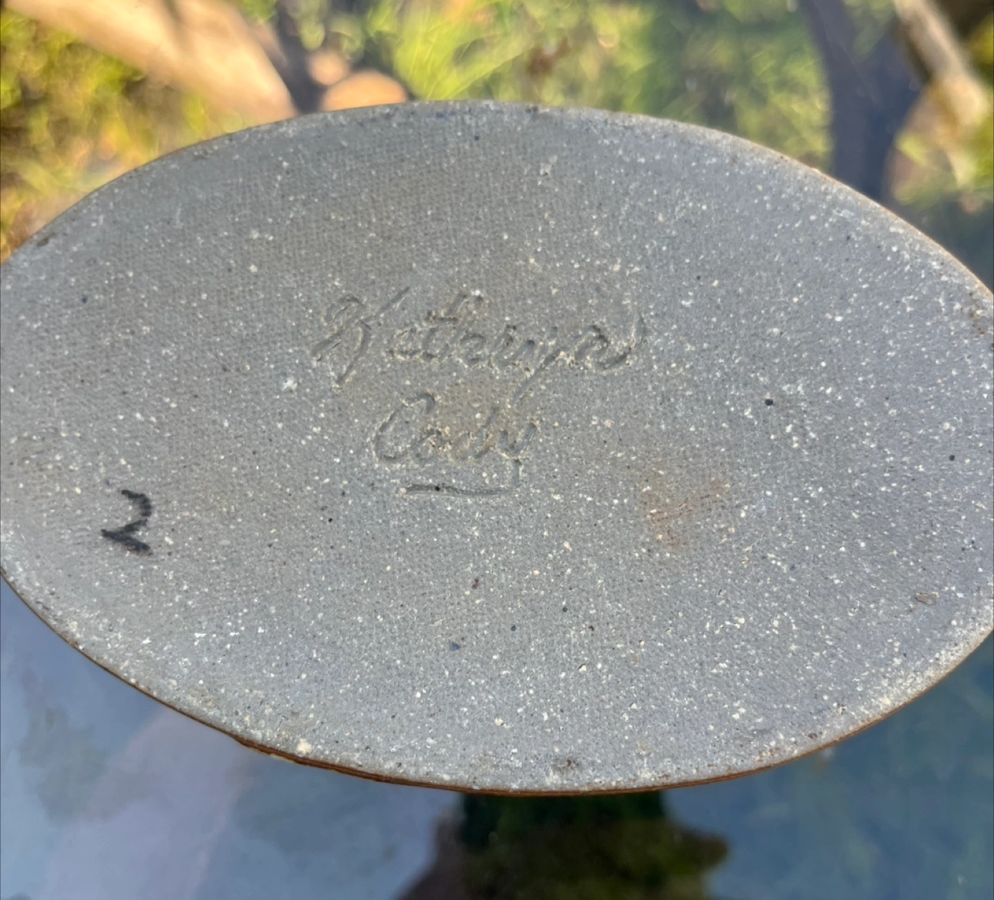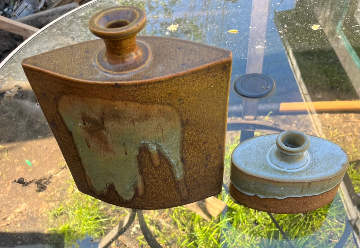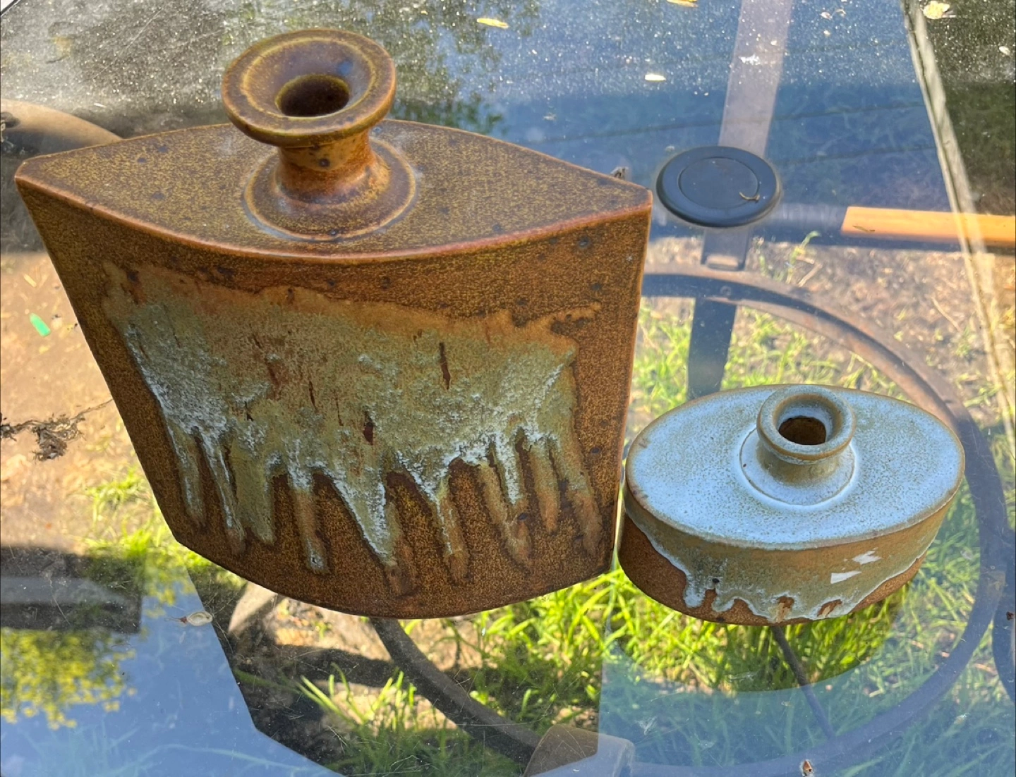 Two unique, handcrafted ceramic vases. Glazed in earthy tones. One is rectangular, the other oval. Small size variations. Excellent addition to any home decor.