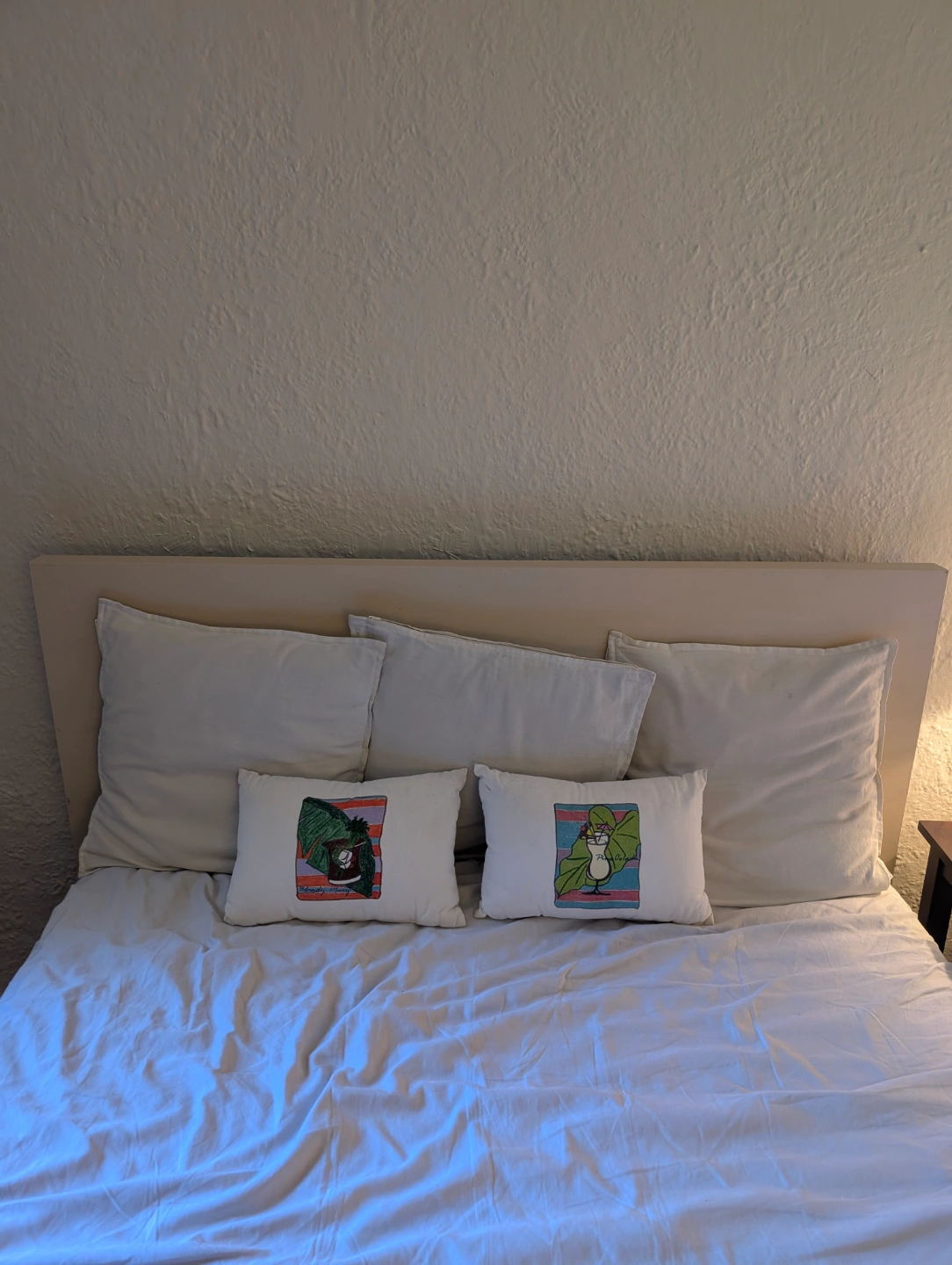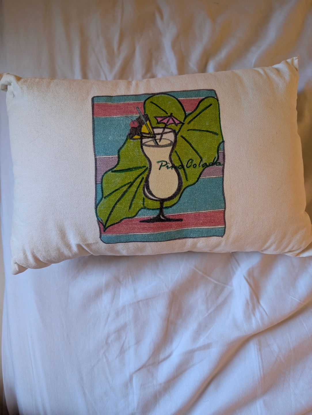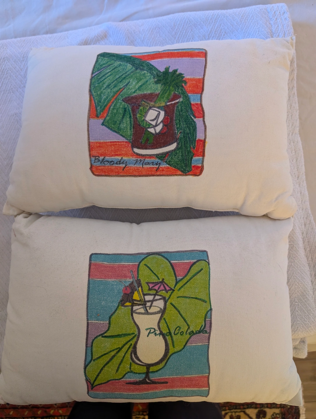 Two matching pillows. Features hand-drawn designs of a Bloody Mary and a Piña Colada. Off-white cotton fabric. Adds a fun, tropical touch to any space.