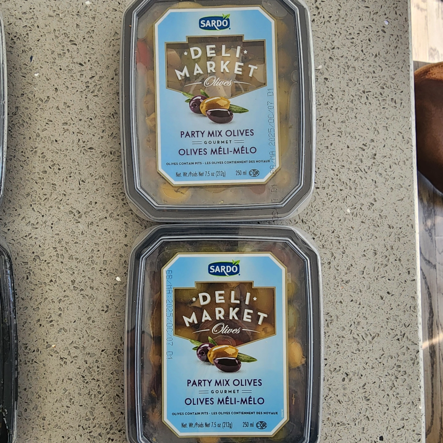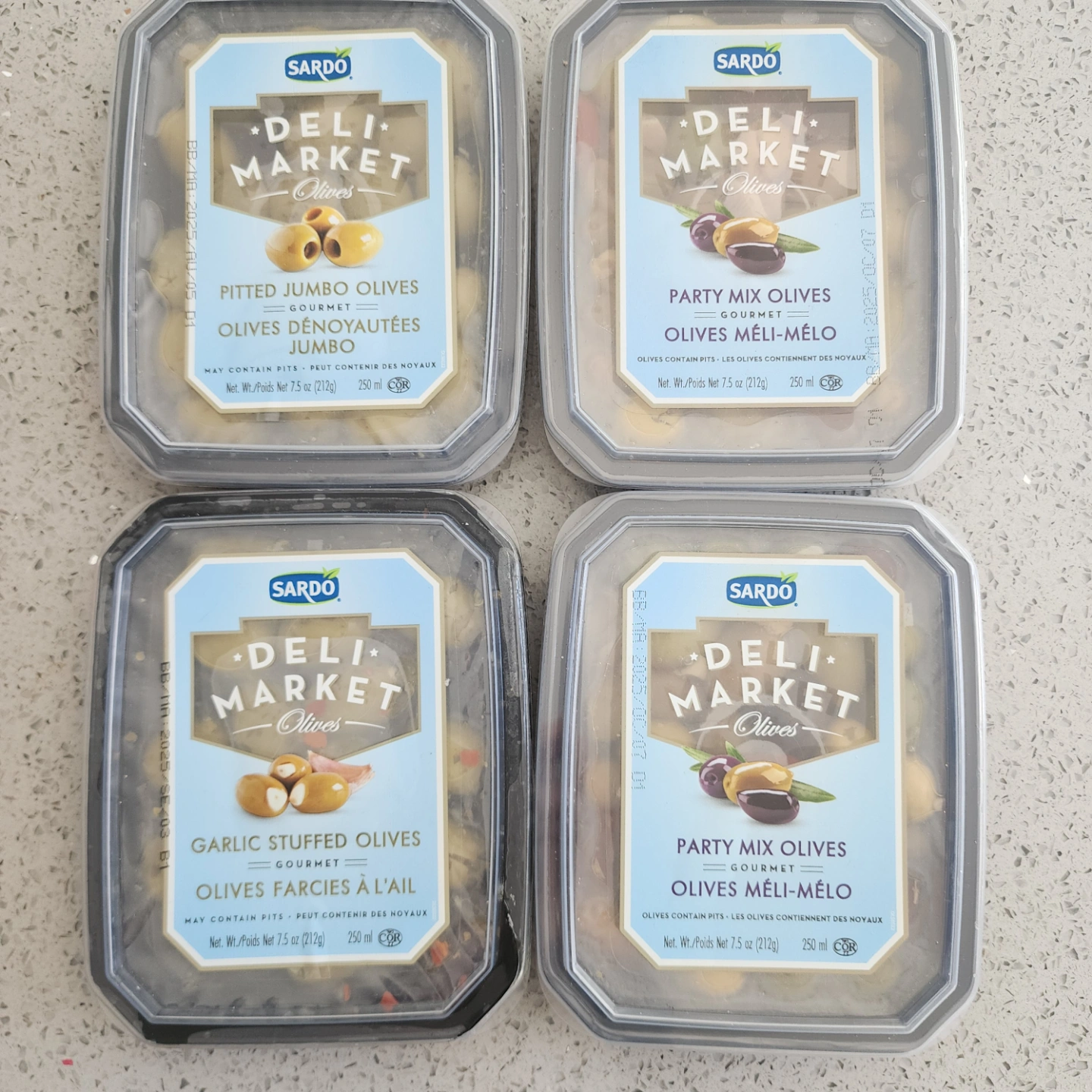 Four containers of Sardo Deli Market olives. Two containers of pitted jumbo olives and two containers of garlic stuffed olives. Gourmet olives, 250 ml each.