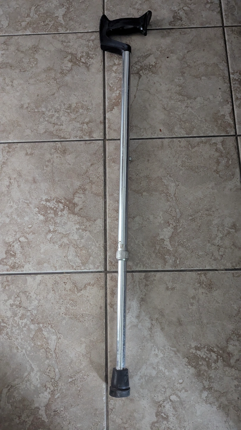 Aluminum walking cane, adjustable height. Features a comfortable, ergonomic handle. Black plastic handle and base. Good used condition.
