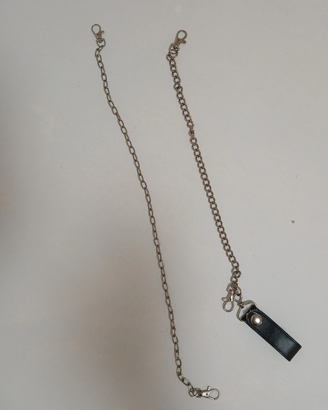 392Pair of silver metal chains. One chain features a small black leather wallet clip. Great for keys or wallets.