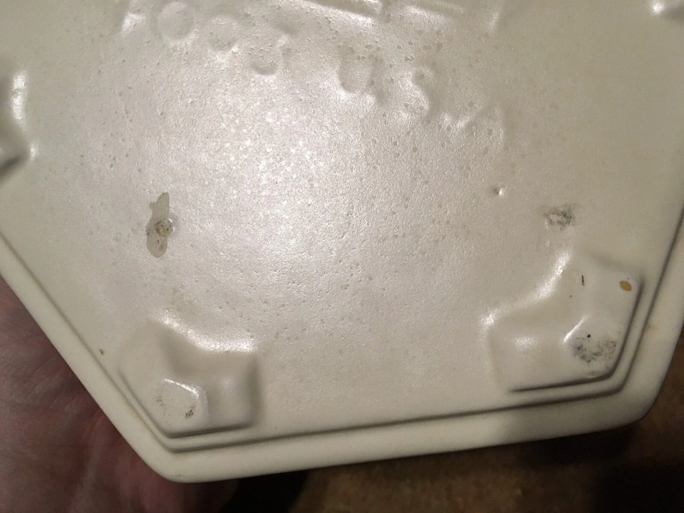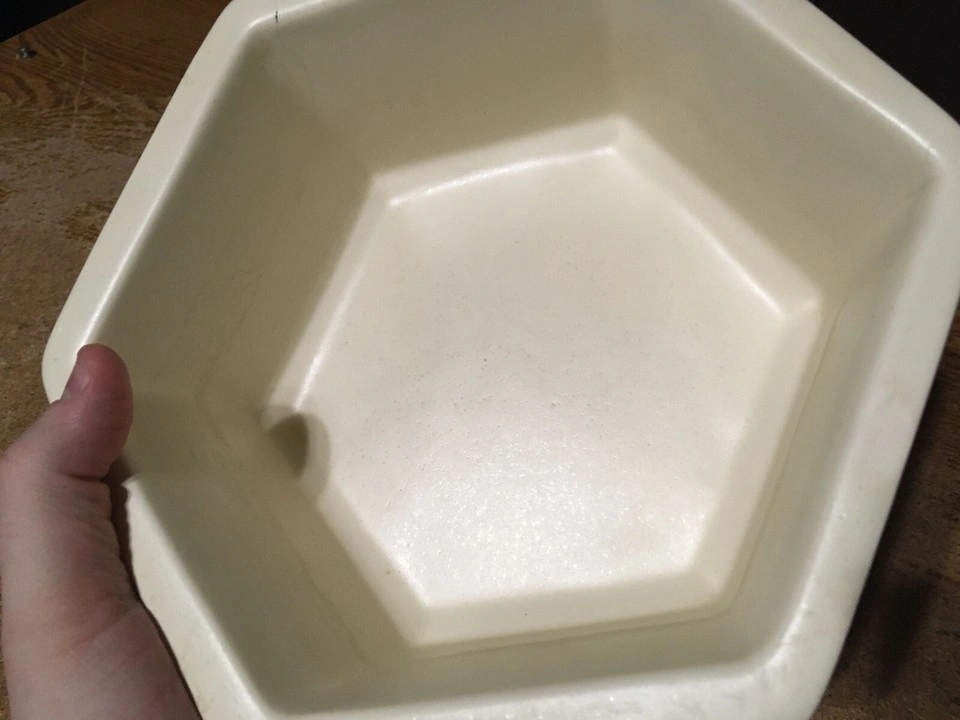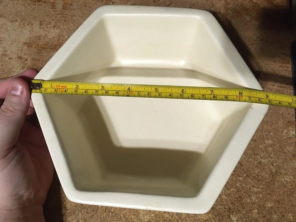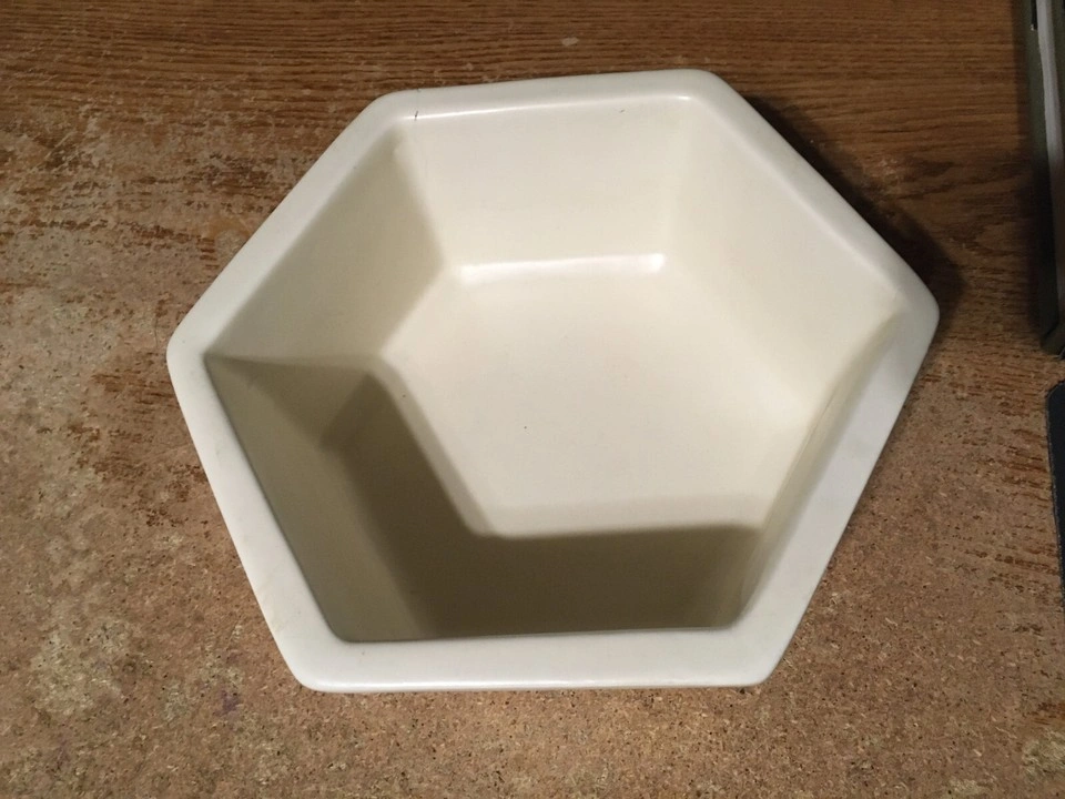 Unique hexagonal bowl. Cream colored ceramic. Shows some minor discoloration. Made in the USA. has some scuffs marks and a couple little chips shown in like pictures six I'm at great with colors but it's like a white cream ish pick up at house