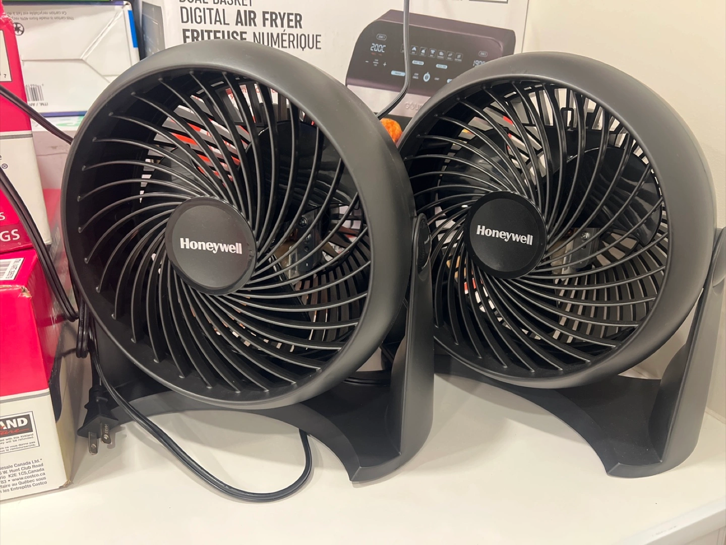 104Two black Honeywell personal fans. Small, compact design. Great for desks or bedside tables.