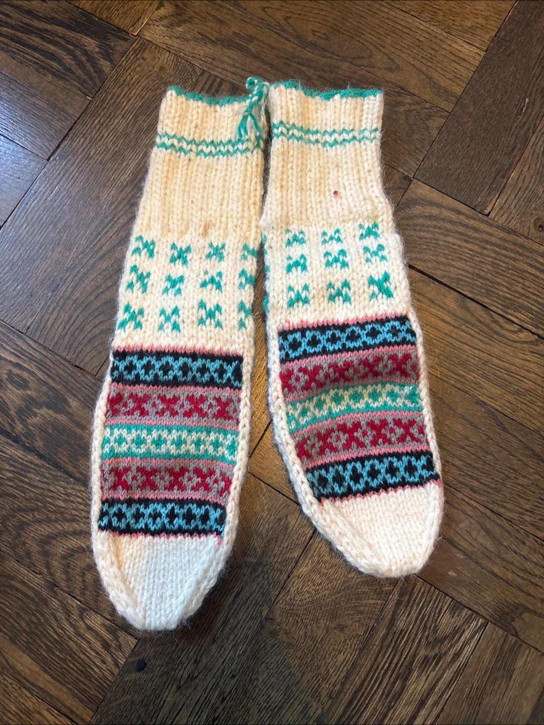 Warm knitted socks. Cream base with teal, red, and black Fair Isle pattern. Handmade in the Himalayas. Cozy and unique. Selling unopened pair