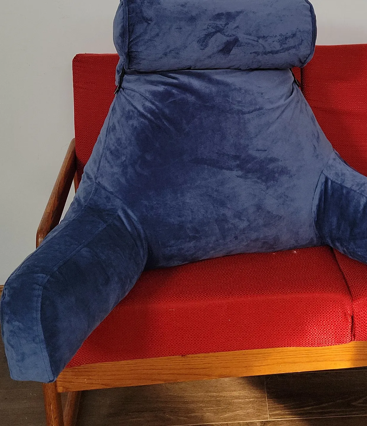 Large, firm and comfy backrest pillow. Navy blue velour-like fabric. Perfect for lounging on the couch or in bed. Offers great lumbar support.