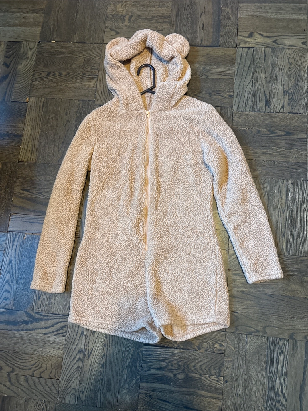 Adorable teddy bear romper. Long sleeves, zipper closure, and cute bear ears on the hood. Perfect for lounging. Size 4 (S)