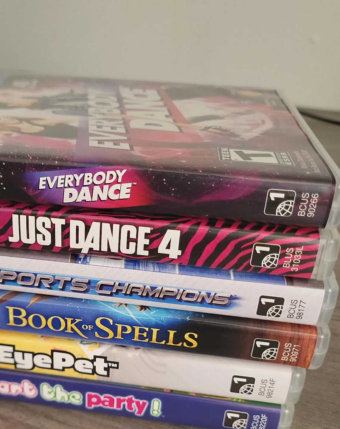 Bundle of six PlayStation 3 games. Includes Everybody Dance, Just Dance 4, Sports Champions, Book of Spells, Start the Party, and EyePet. Pre-owned, but in good condition. Perfect for game nights!