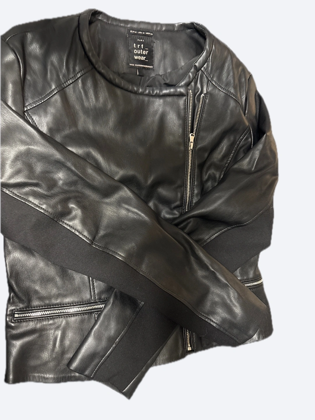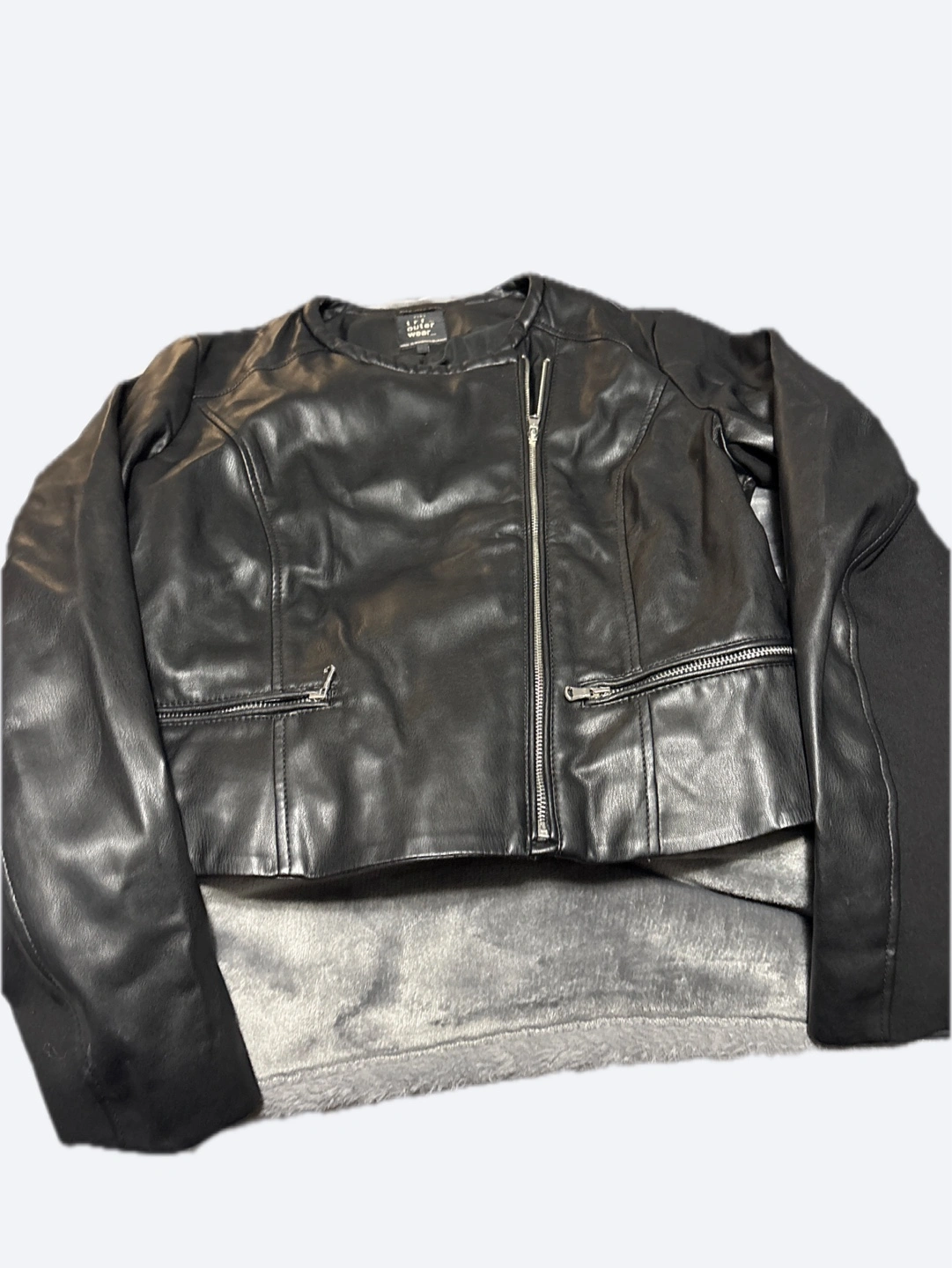 Women's black faux leather jacket. Size Medium. Asymmetrical zipper closure. Two zippered pockets. Soft lining. Excellent condition.