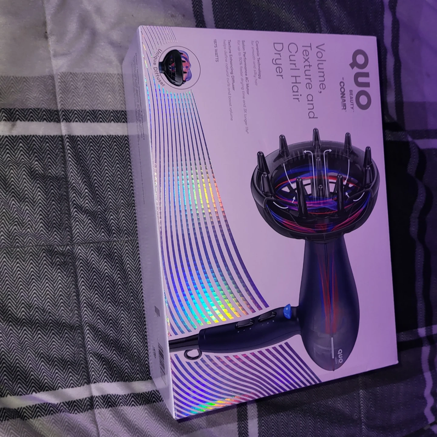 QUO Beauty Volume, Texture and Curl Hair Dryer. It features Ceramic Technology for smooth hair and a Salon Performance AC Motor for faster drying. The texture enhancing diffuser helps define natural curls and boost volume. 1875 watts.