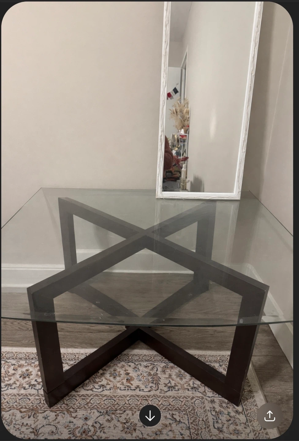 This coffee table features a sleek glass top and a unique dark wood geometric base. It's a modern piece that'll tie your living room together! The dimensions are approximately 30 inches wide by 18 inches high.