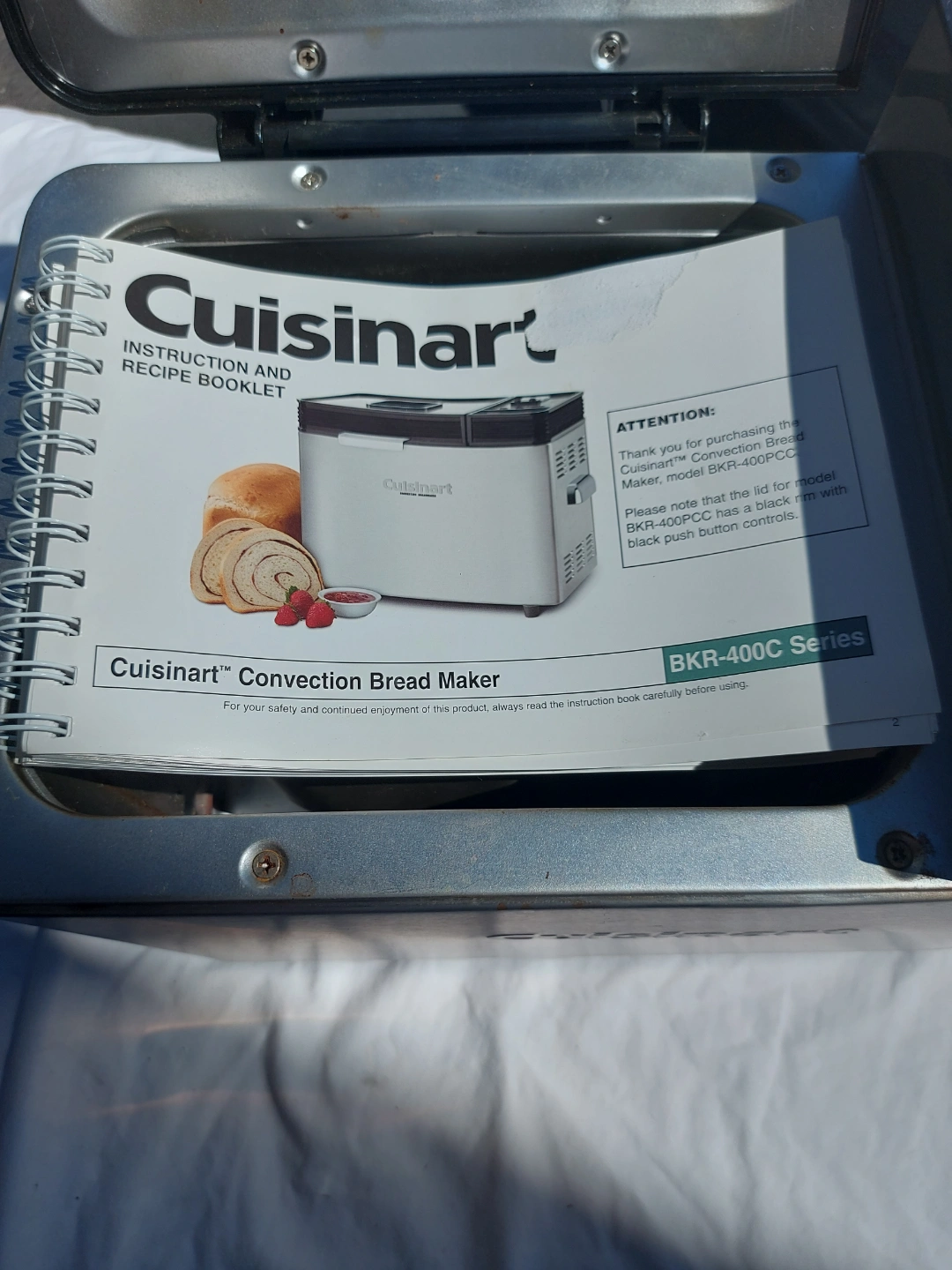 Used Cuisinart bread maker. Model BKR-400PC. Makes various breads, including gluten-free options. Includes instruction booklet.