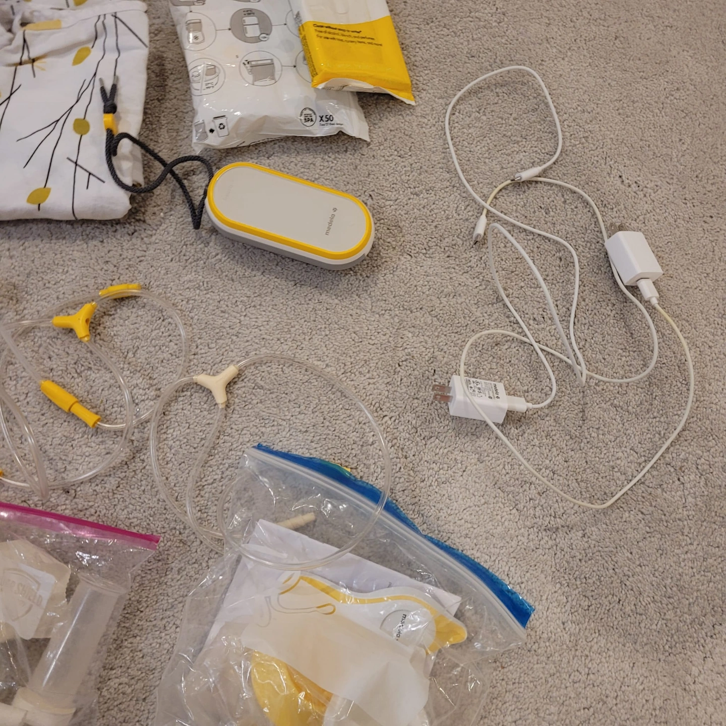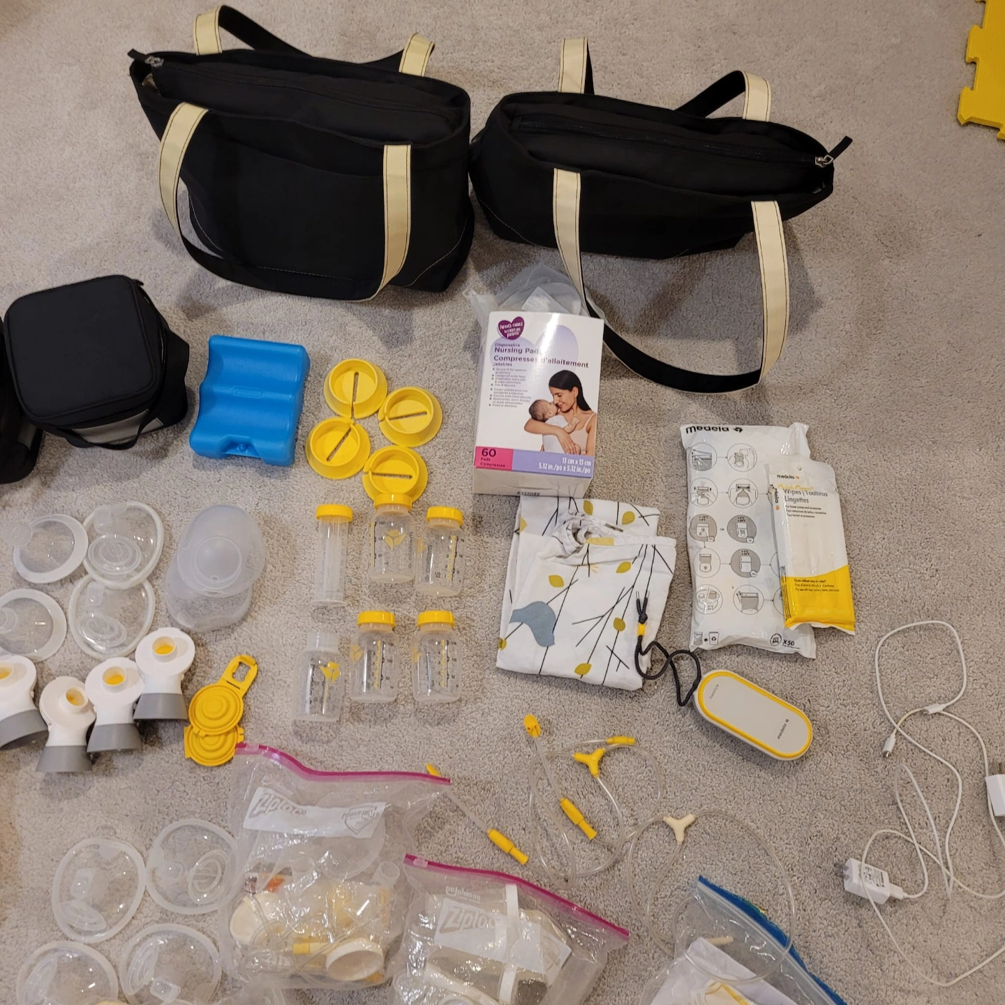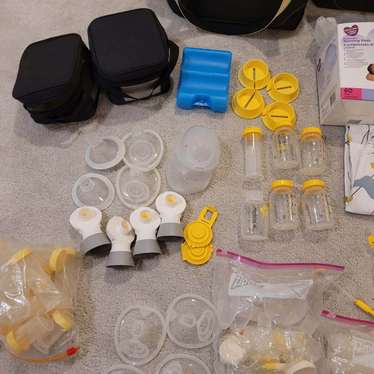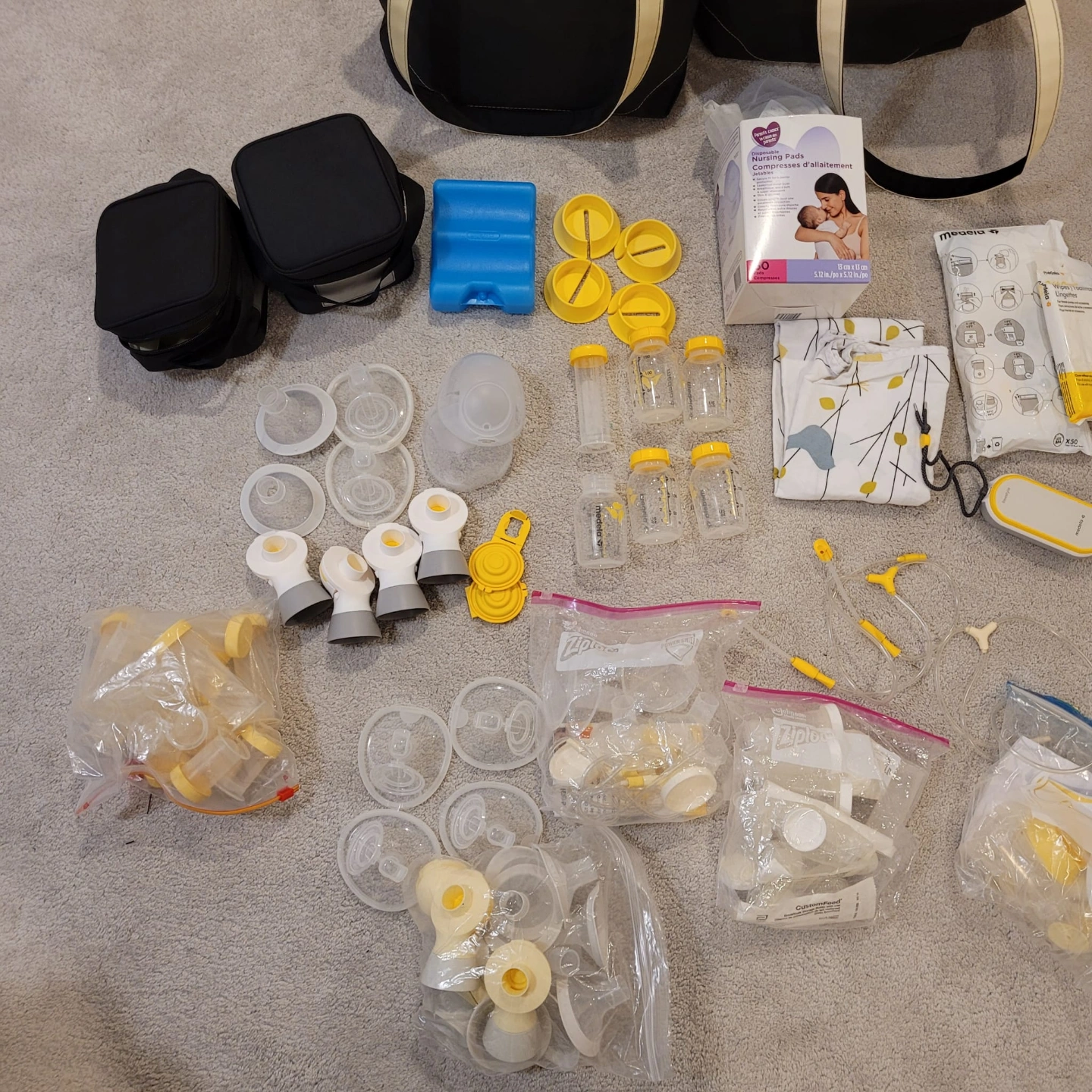 Medela Freestyle double electric breast pump. Includes extra parts, bottles, bags, cooler bag, and nursing pads. Excellent condition, barely used. Everything shown in photos included.