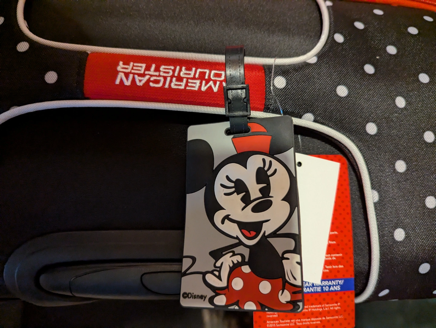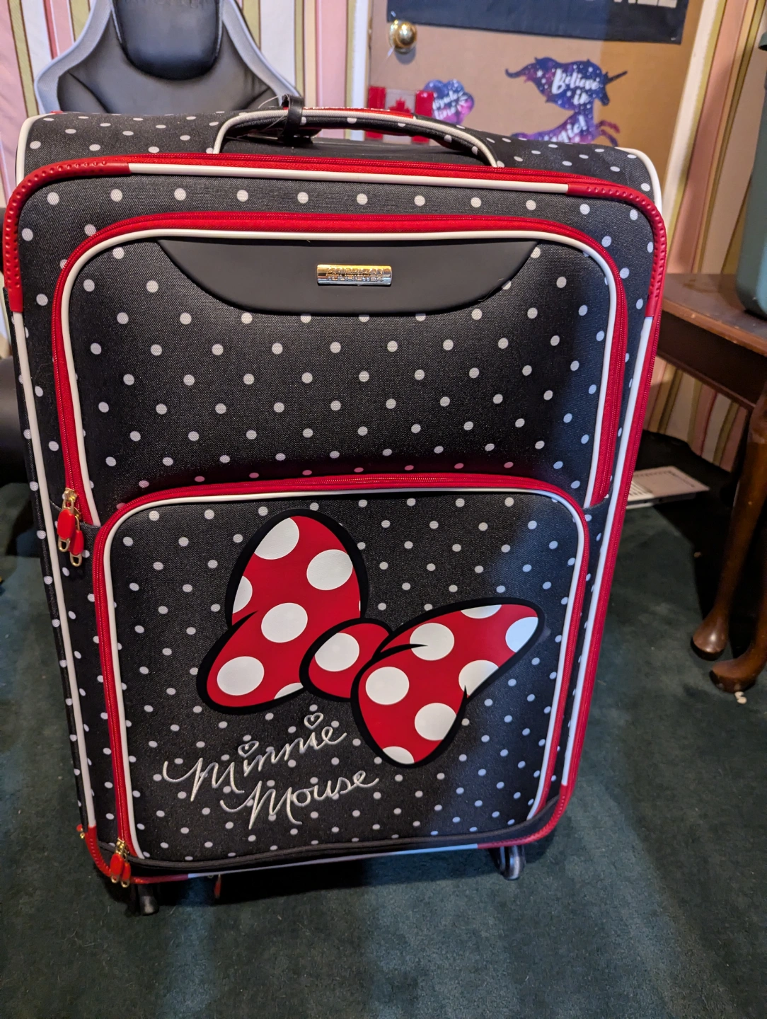 Large Minnie Mouse Disney Branded Luggage by American Tourister Brand new with tags, retails for 250-300 Beautiful detailing, comes with luggage tag as well. Expandable by zipper expansion! Everything works perfectly!