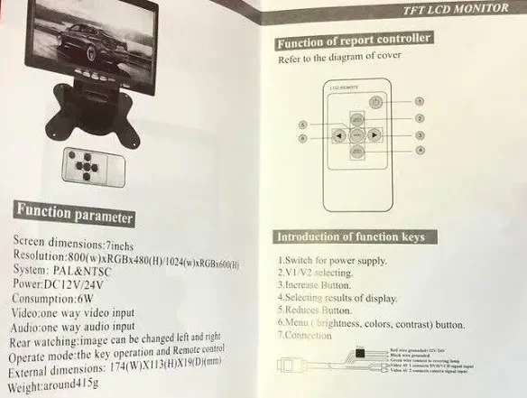 1000+Seven inch TFT LCD color monitor. Includes remote control, mounting bracket. Features one way video input and audio. Resolution 800xRGBx480. Power: DC12V/24V. Excellent for vehicles.
