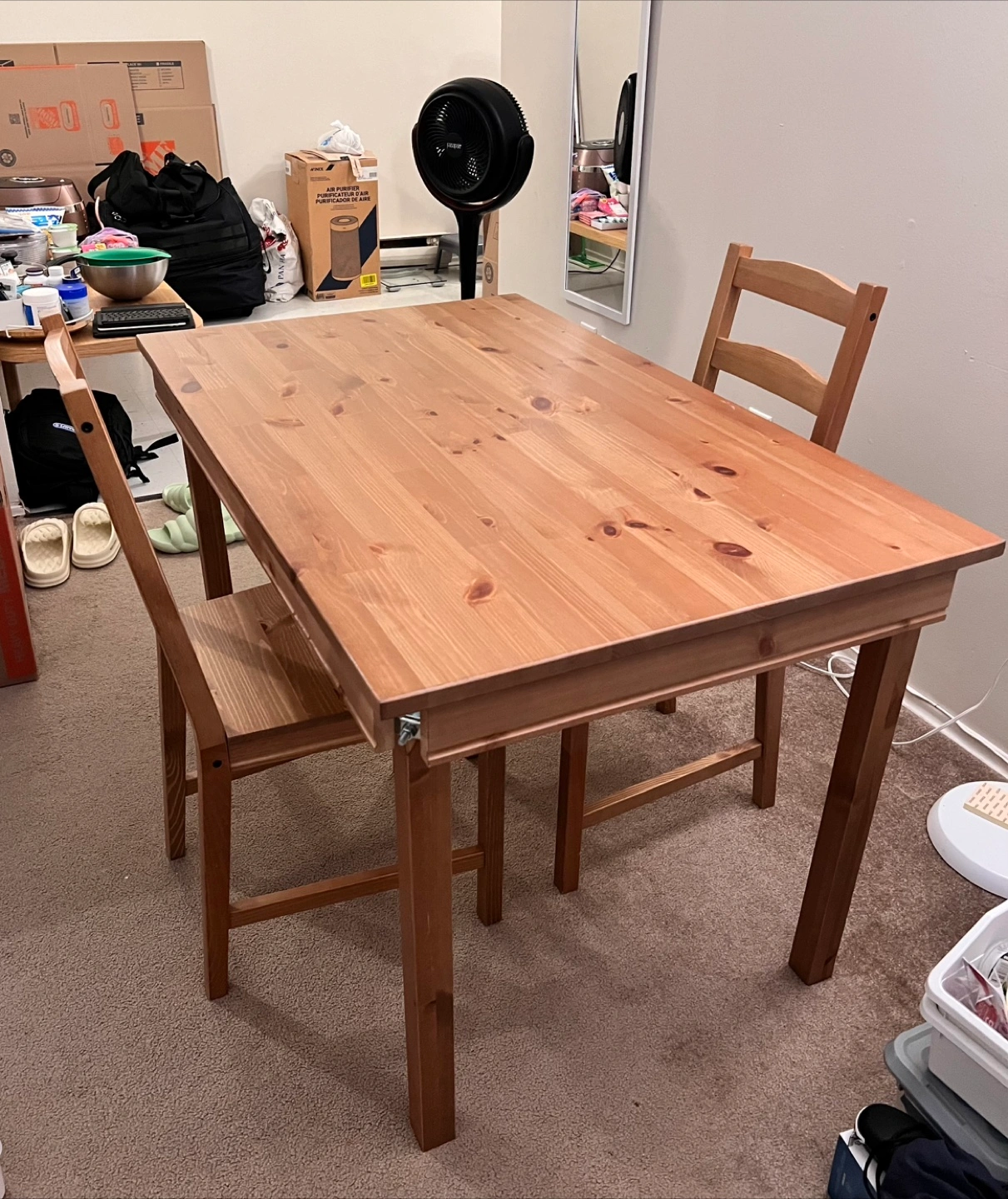 Buy & SellIKEA Jokkmokk Dining Set - Table and Two ChairsIKEA Jokkmokk Dining Set - Table and Two Chairs$20Moving sale Solid pine wood dining set. Includes one table and two chairs. Minimal assembly required. Good used condition. $20 Pickup onlyConditionGoodWHERE TO MEET88 Southpark Drive Parking lotView MapSELLERverifiedSungwooSouthpark Station18311 reviews1 chats·0 favorites·129 views