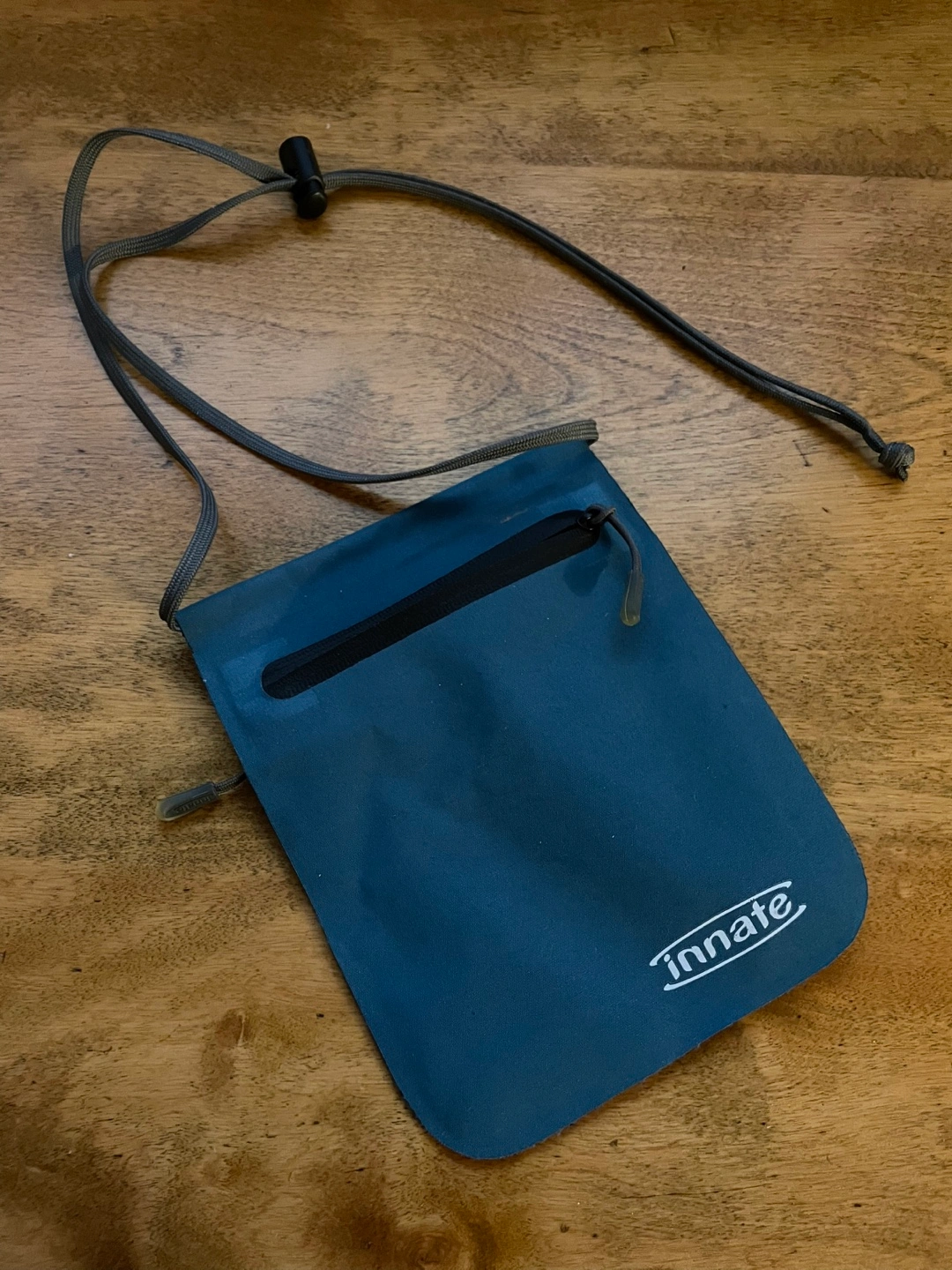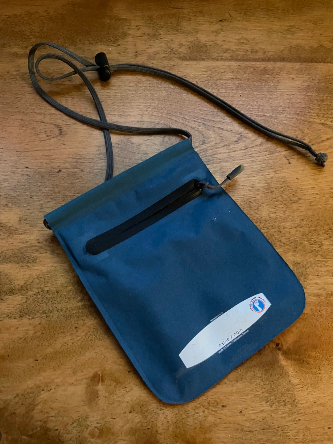 Small waterproof pouch. Features zipper closure and adjustable neck strap. Blue color.