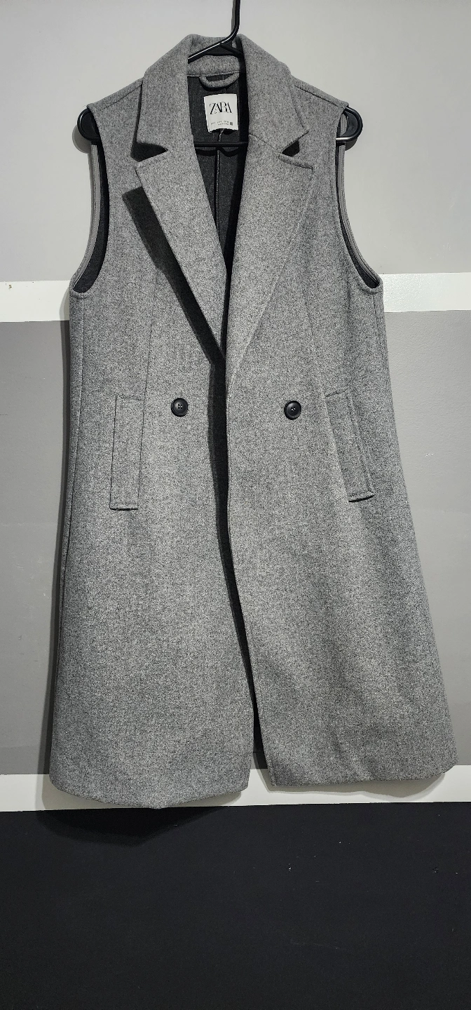 15Women's sleeveless vest. Grey wool blend. Size small. Double breasted. Two pockets. Good condition. worn only once for couple of hours