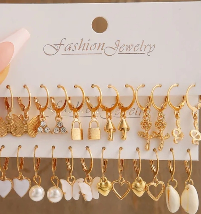 Assortment of gold hoop earrings. Various cute charms: bows, crystals, padlocks, mushrooms, roses, hearts, pearls, seashells, and butterflies. Perfect for everyday wear or accessorizing.