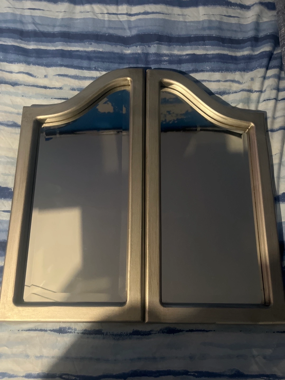 Unique double mirror. Arched top. Silver painted finish. Hinged. Perfect for a vanity or entryway. Smoke free pet free need gone asap