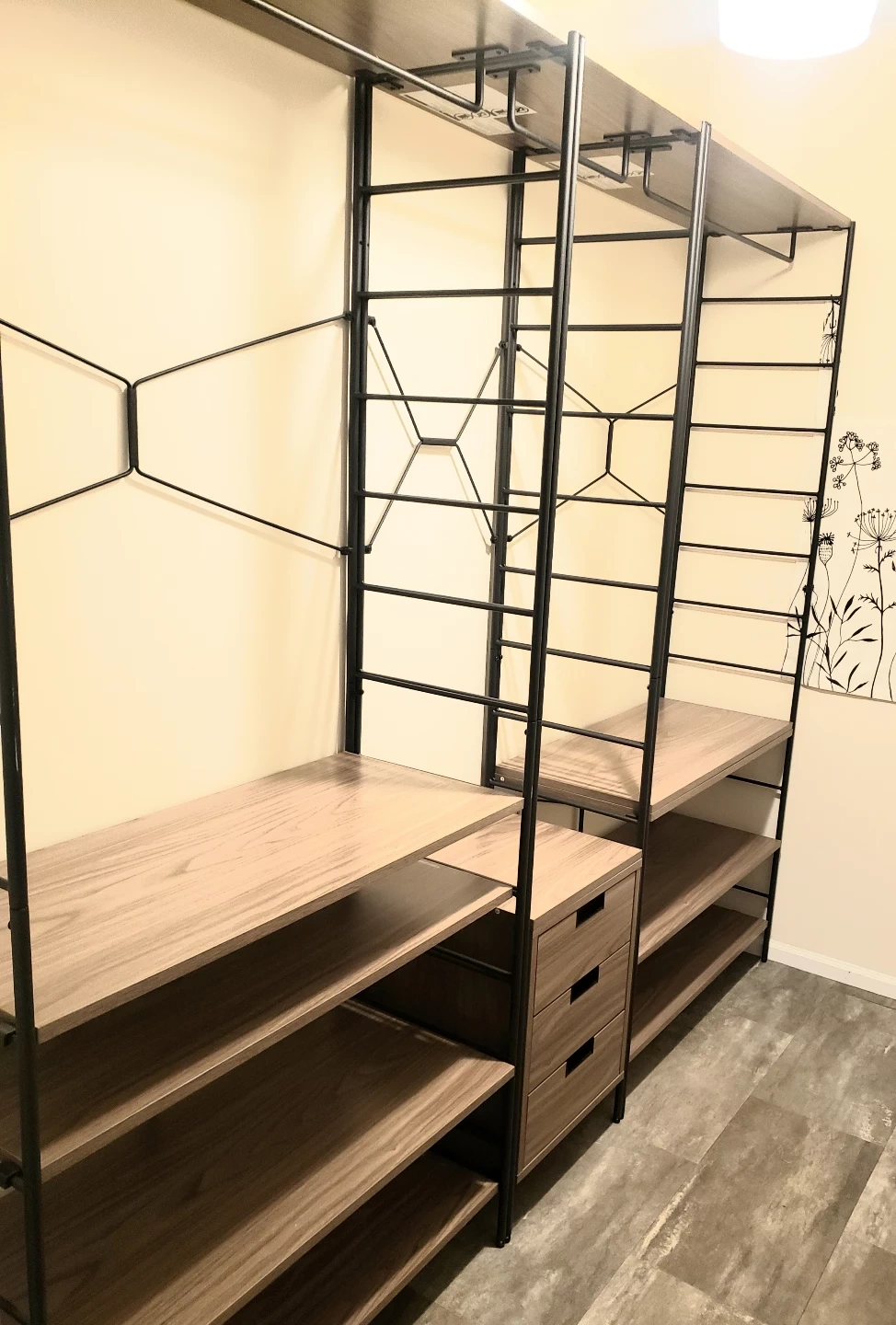 Stylish and functional closet organizer. Black metal frame, four wood shelves and 3 drawers. Lots of storage space. Perfect for maximizing closet organization.