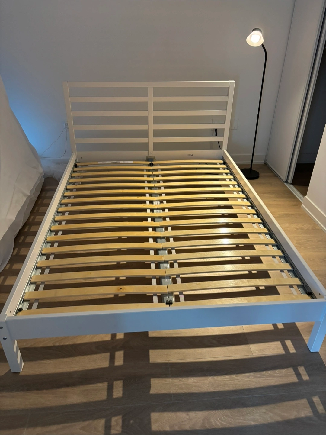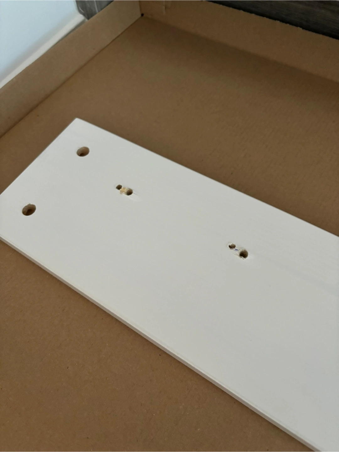It’s all packed up in the original box, pretty much brand new - minus right wooden piece has misaligned pre drill holes (I tried to drill it myself, but couldn’t do it). Please see photos for errors.