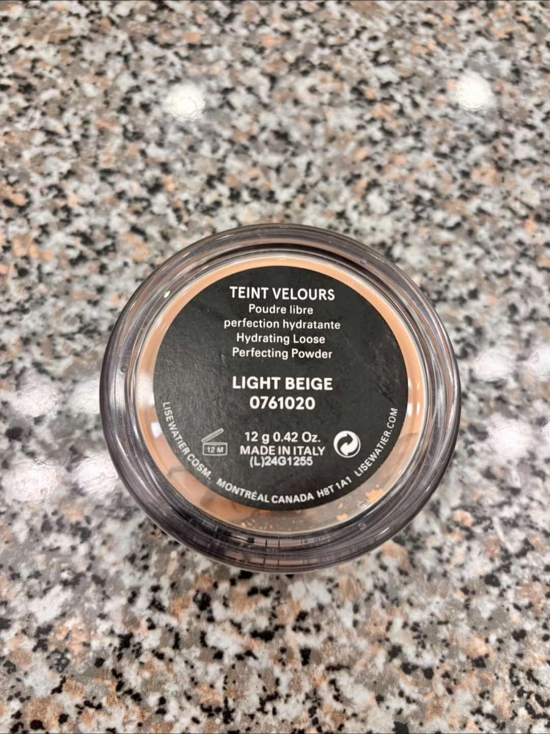 Lightly used Lise Watier Teint Velours Hydrating Loose Perfecting Powder in shade Light Beige 0761020. 12 g / 0.42 oz. Made in Italy. Compact included.