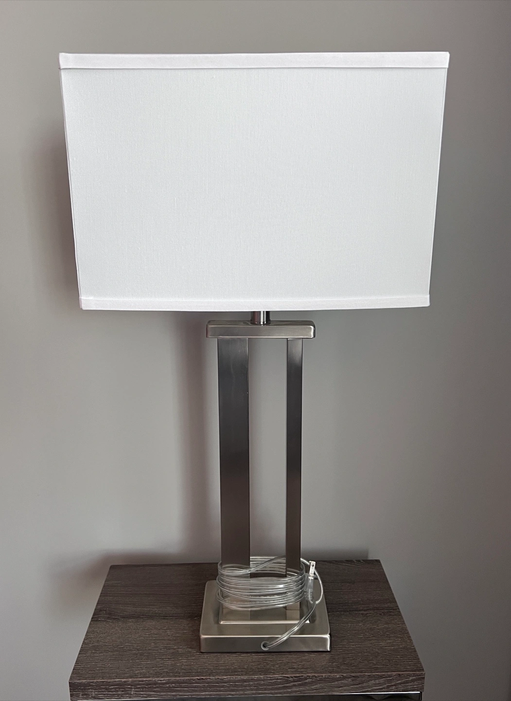 Ashley minimalist table lamp in great condition. Brushed nickel finish. Rectangular white fabric shade. 29.5 inches tall. Great for bedside table or end table.