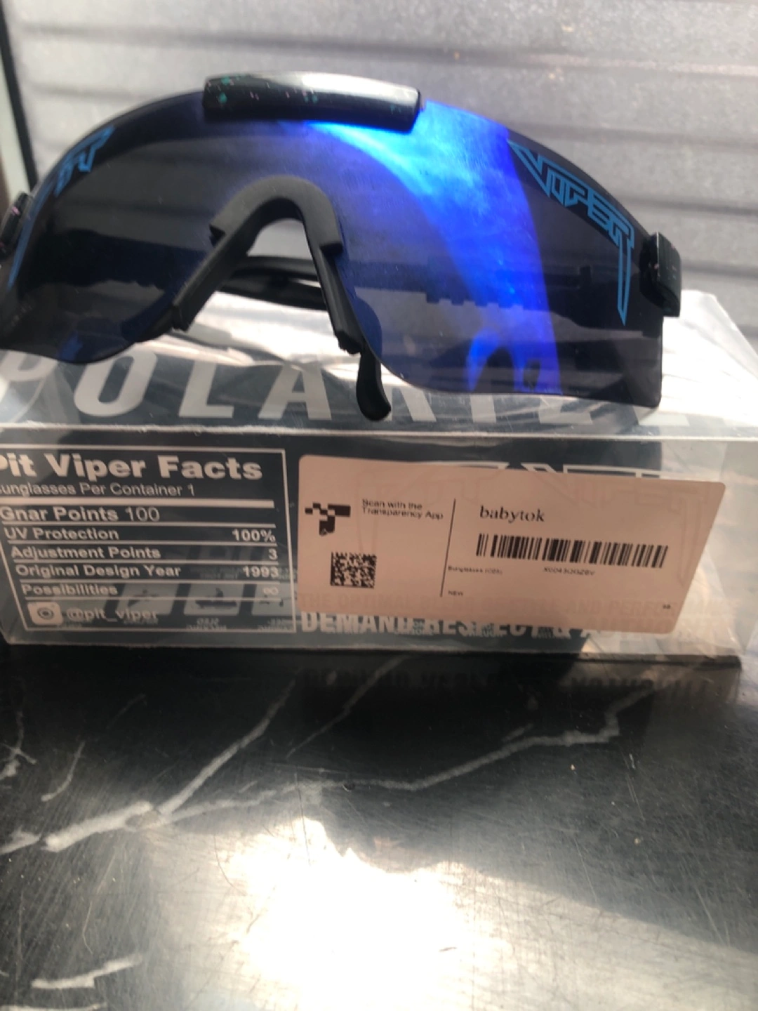 Pit Viper sunglasses. Blue lenses. Polarized. New in box. Gnar points 100. UV protection 100%. Original design year 1995.