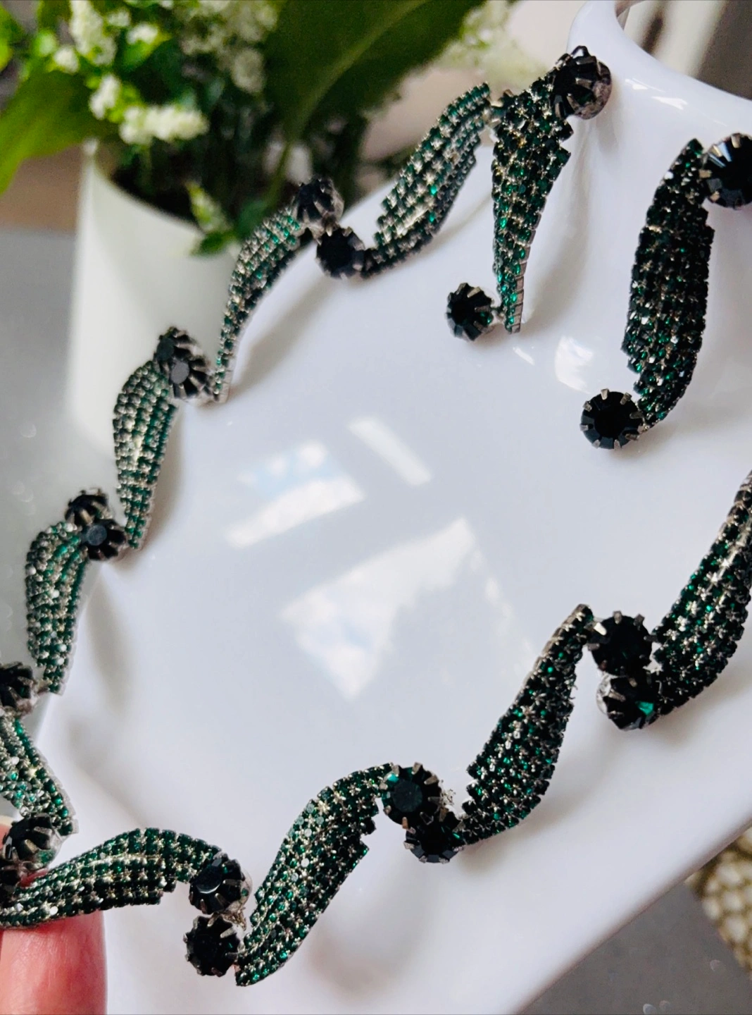 244Stunning necklace and earrings set. Features dark green rhinestones. Beautiful wave design. Perfect for a special occasion.