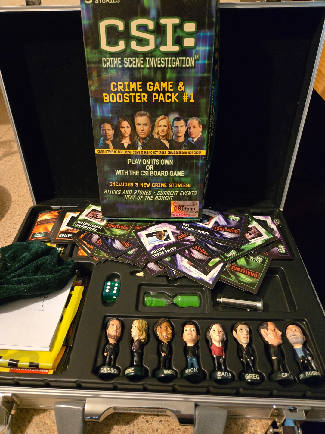 Complete CSI board game and booster pack #1. Includes game board, cards, figurines, and carrying case.