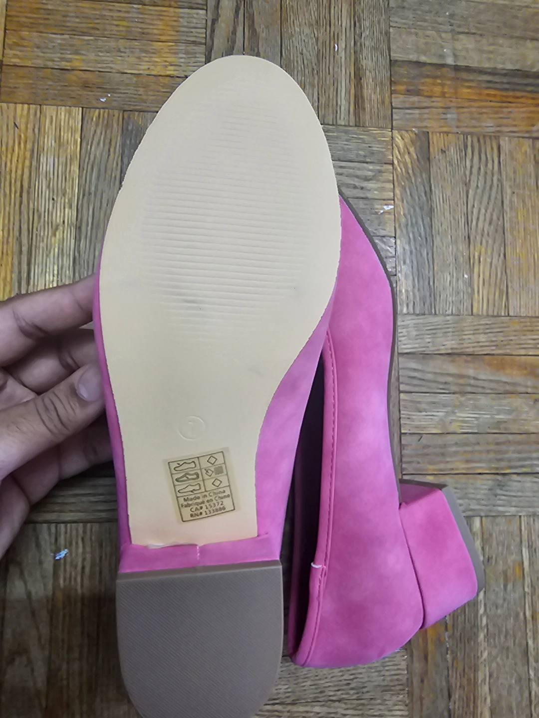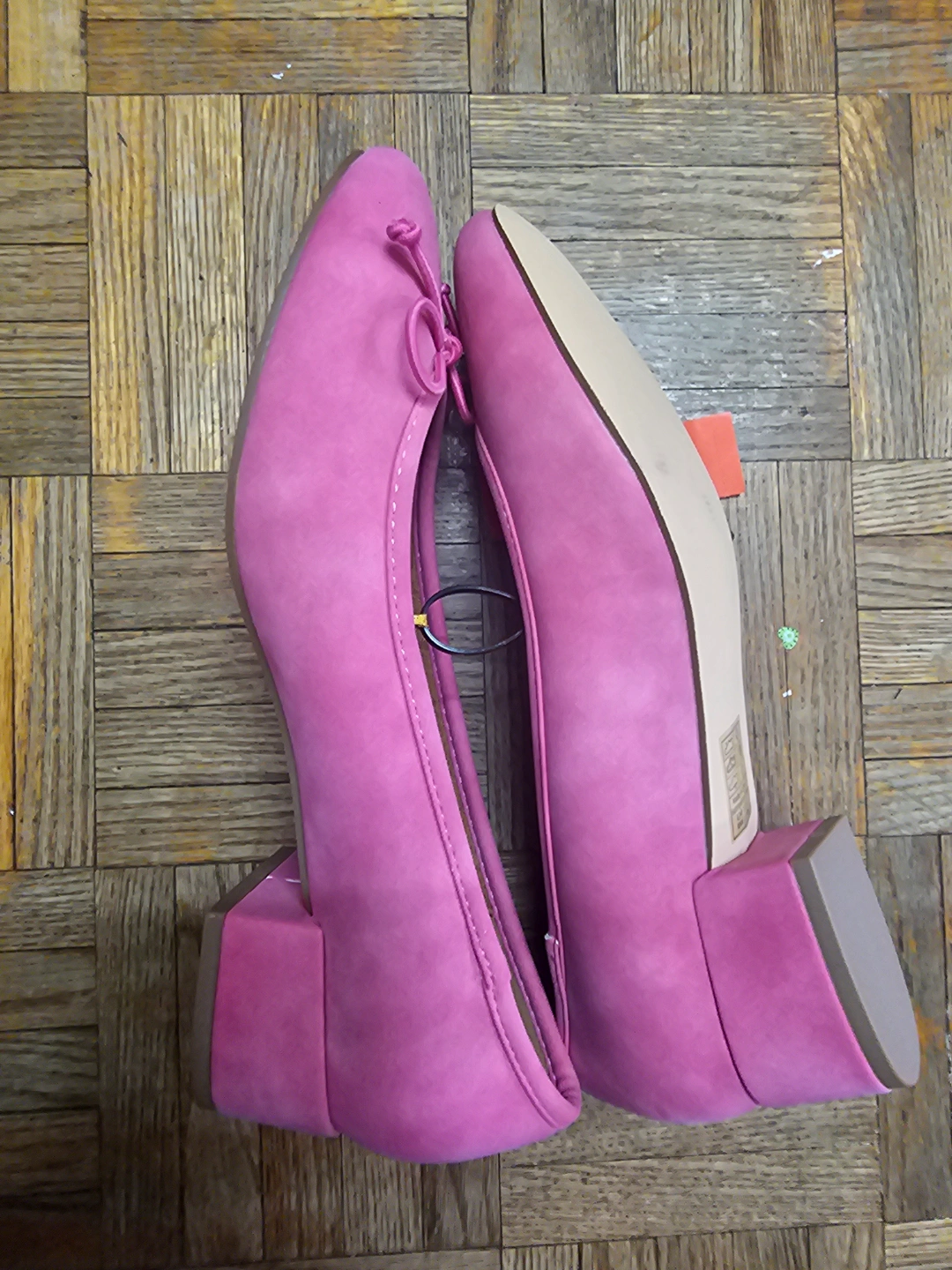 Cute pink shoes. Low block heel. Bow detail. Size 7. Suede-like material.
