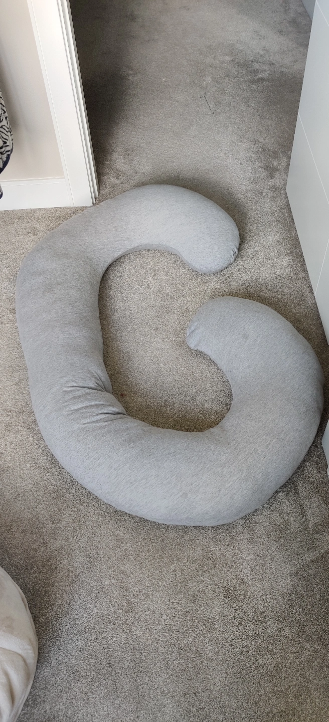 Large grey maternity pillow. C-shape design. Supportive and comfortable. Great for sleeping during pregnancy.
