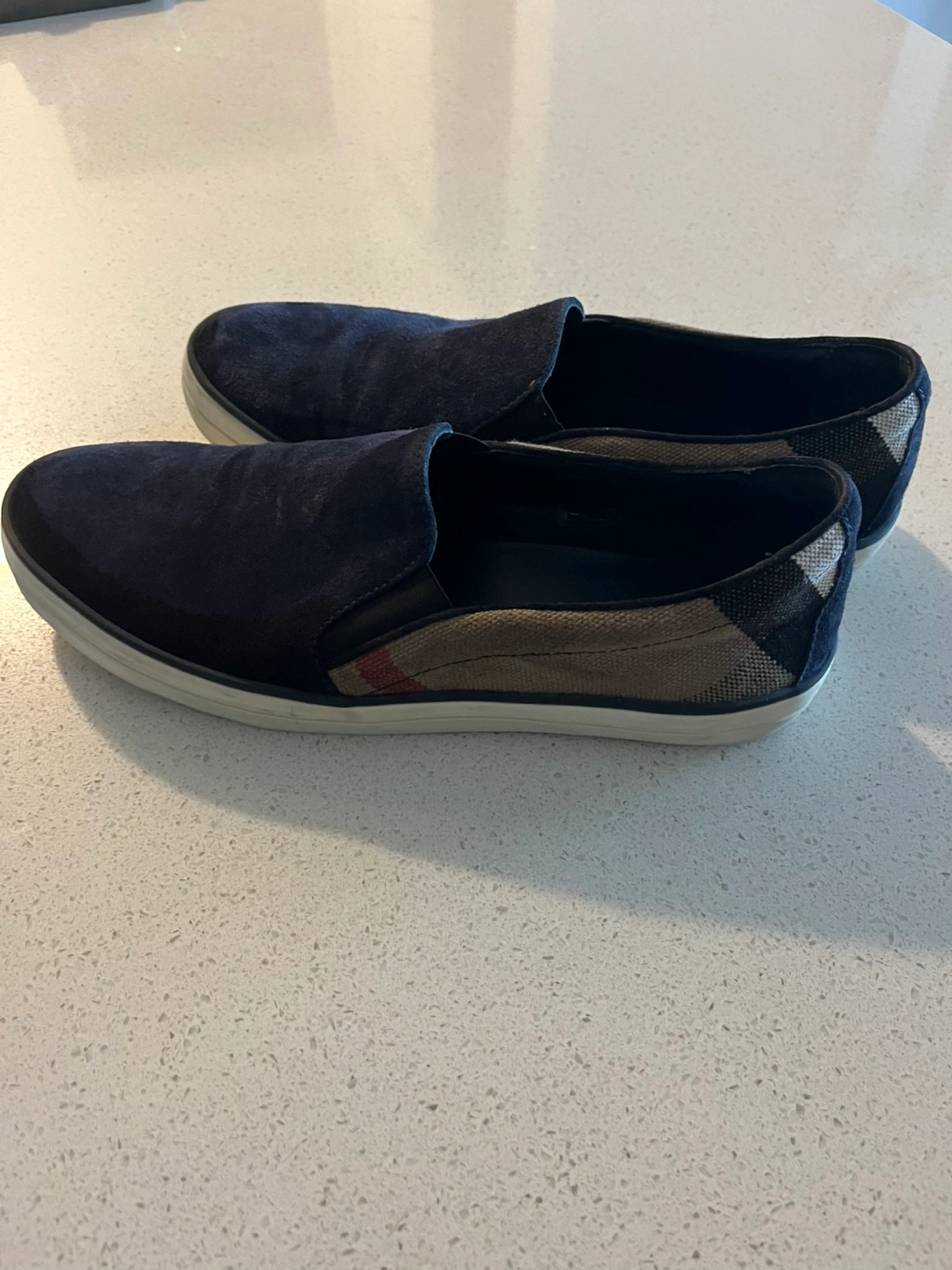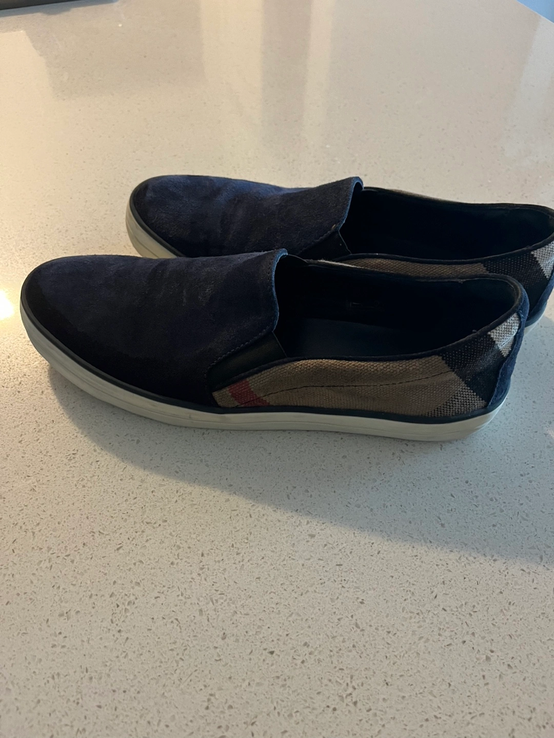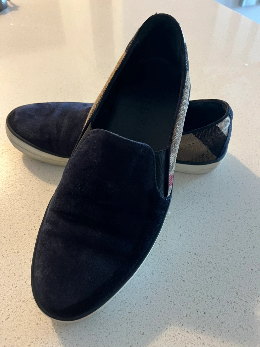 71Navy blue suede slip-on shoes. Feature Burberry check pattern detail. White rubber sole. Pre-owned.