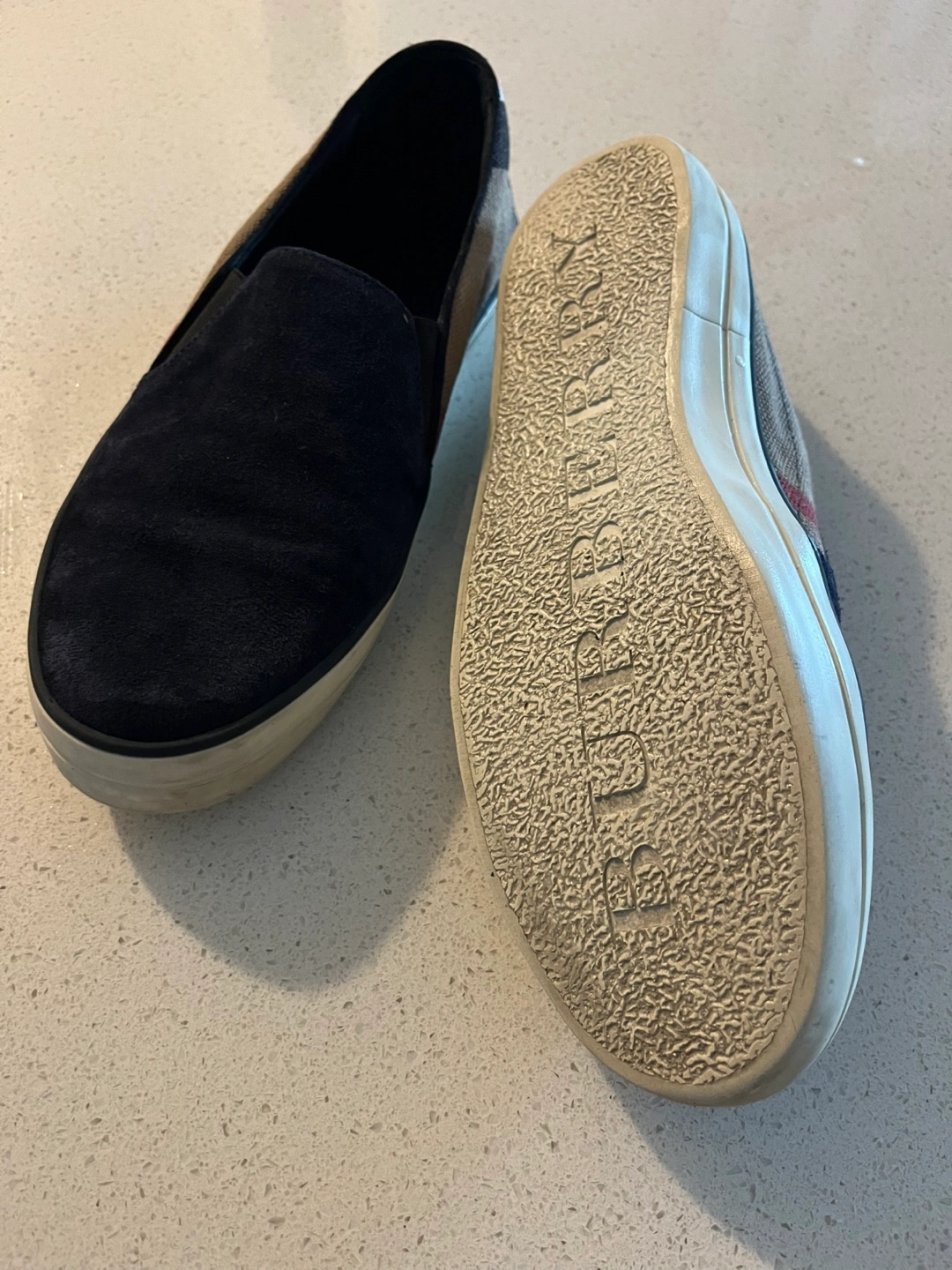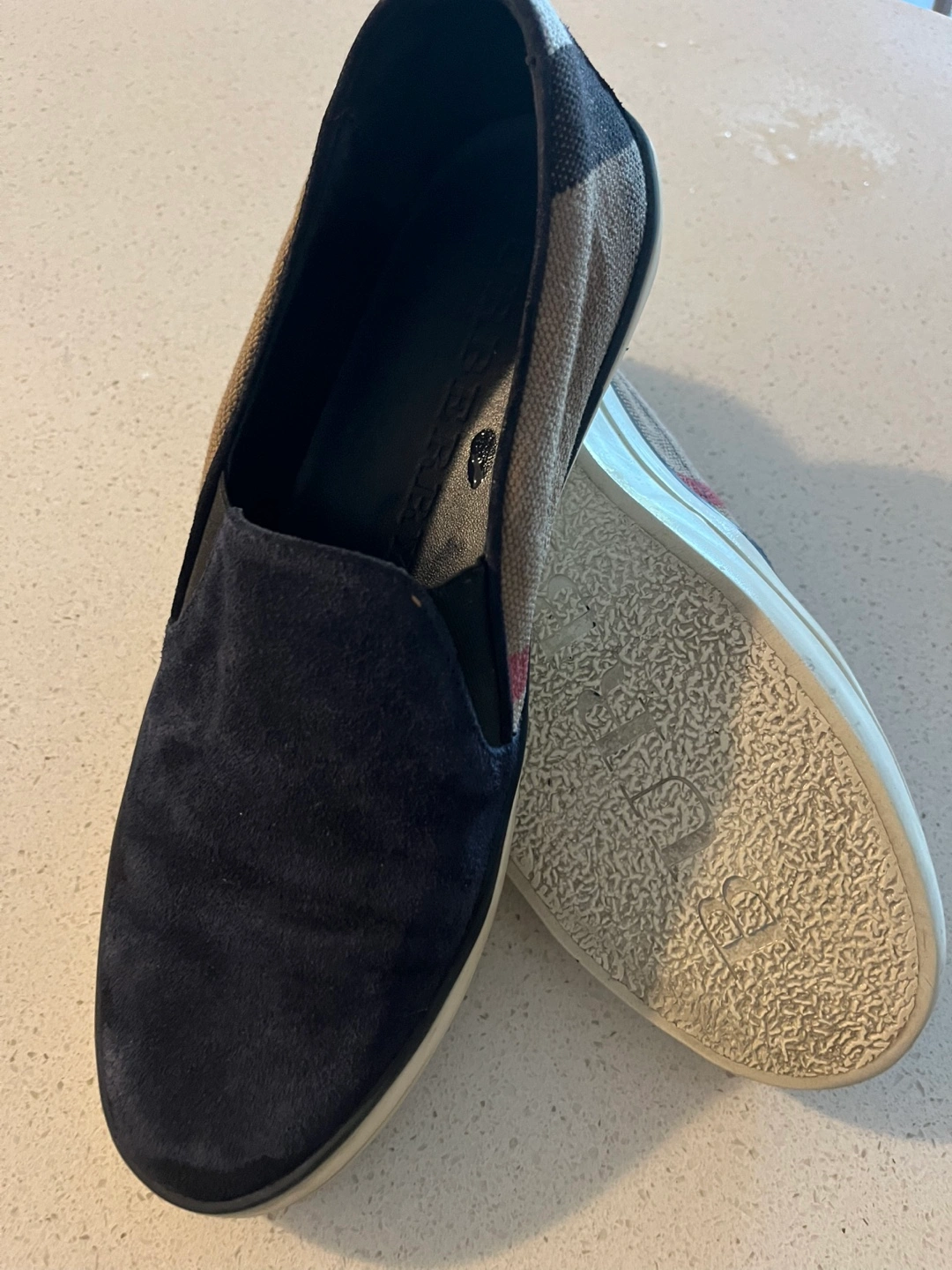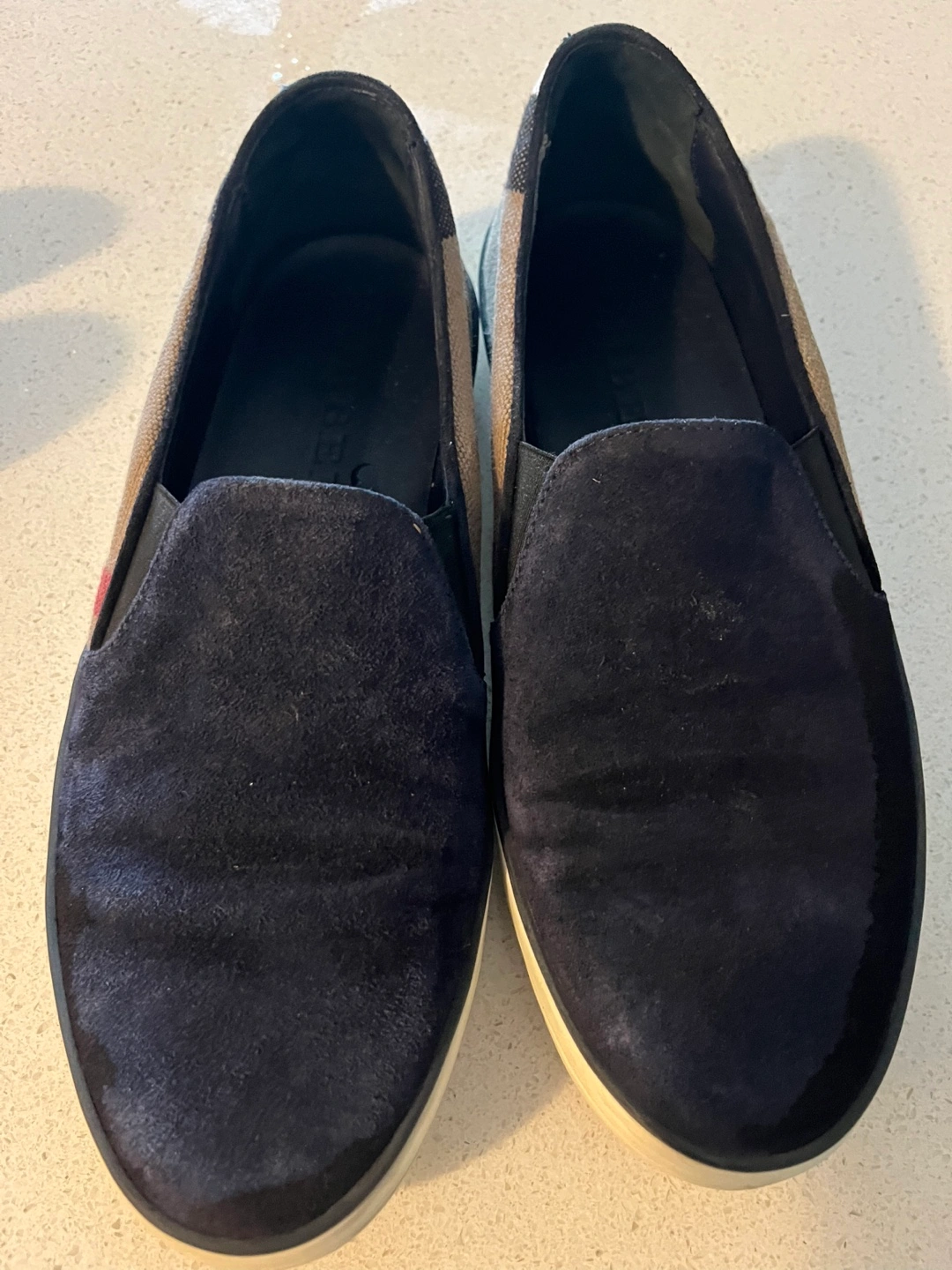 71Navy blue suede slip-on shoes. Feature Burberry check pattern detail. White rubber sole. Pre-owned.