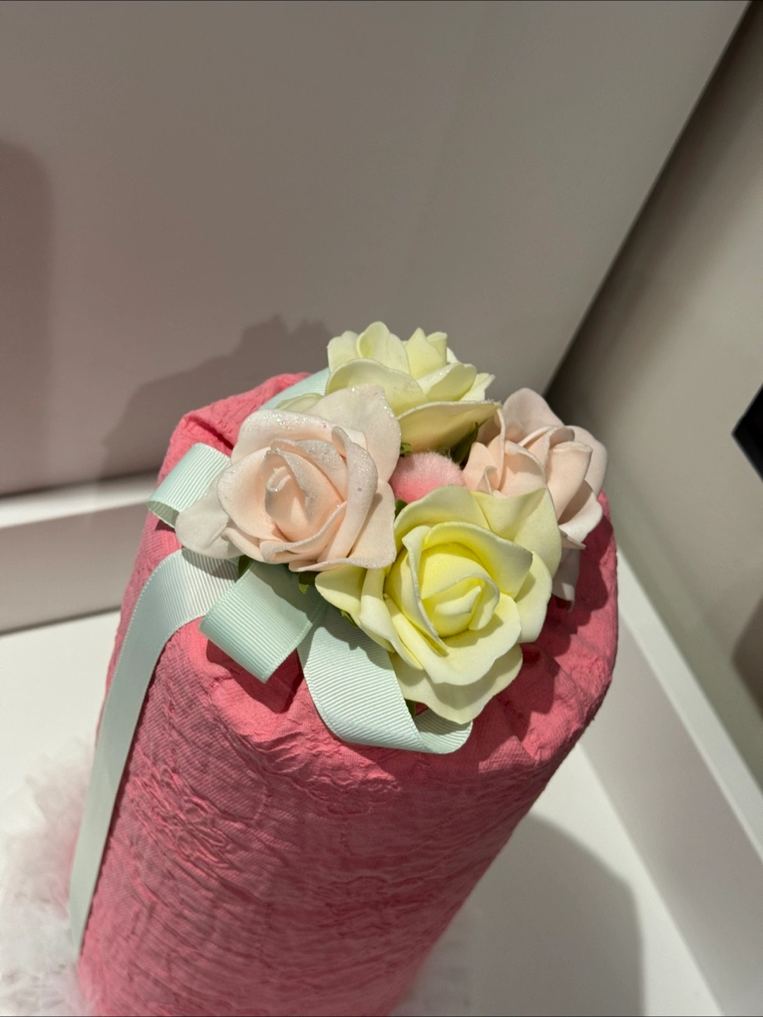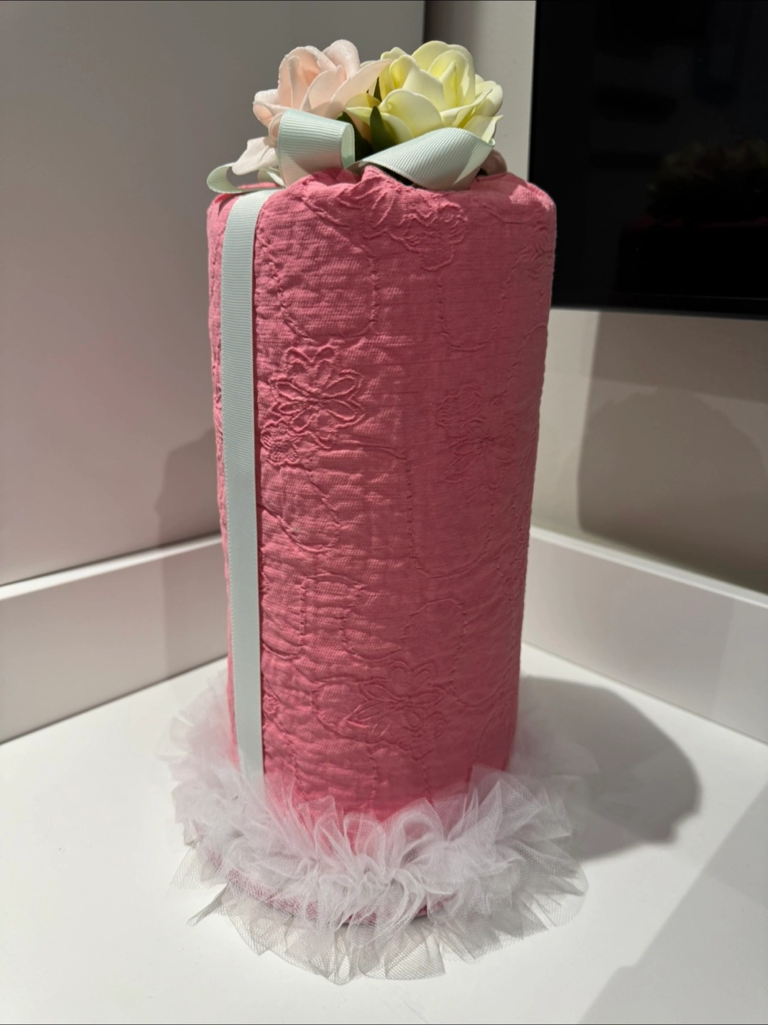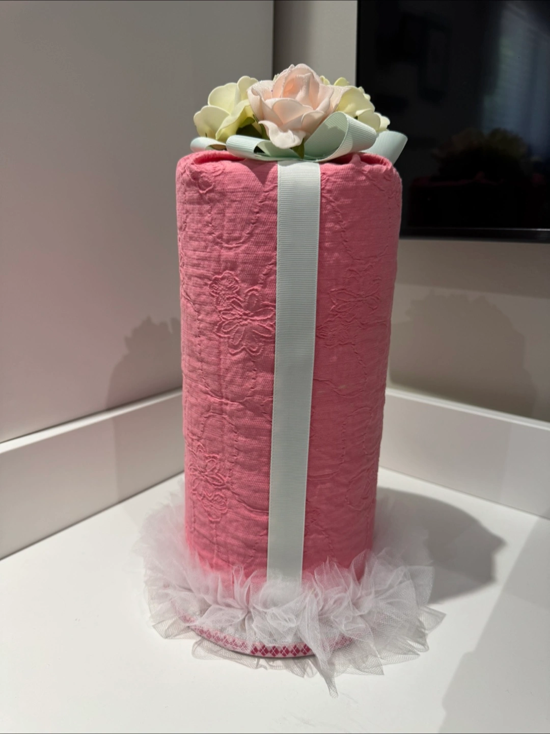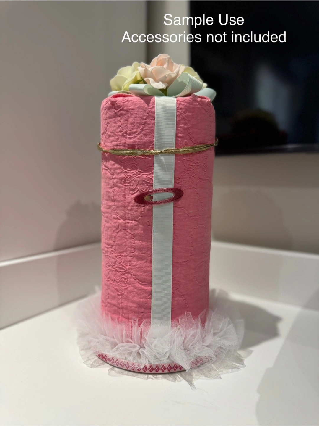 Adorable pink fabric headband organizer. Features a textured fabric and tulle base. Perfect for storing headbands and hair clips of your little girl.