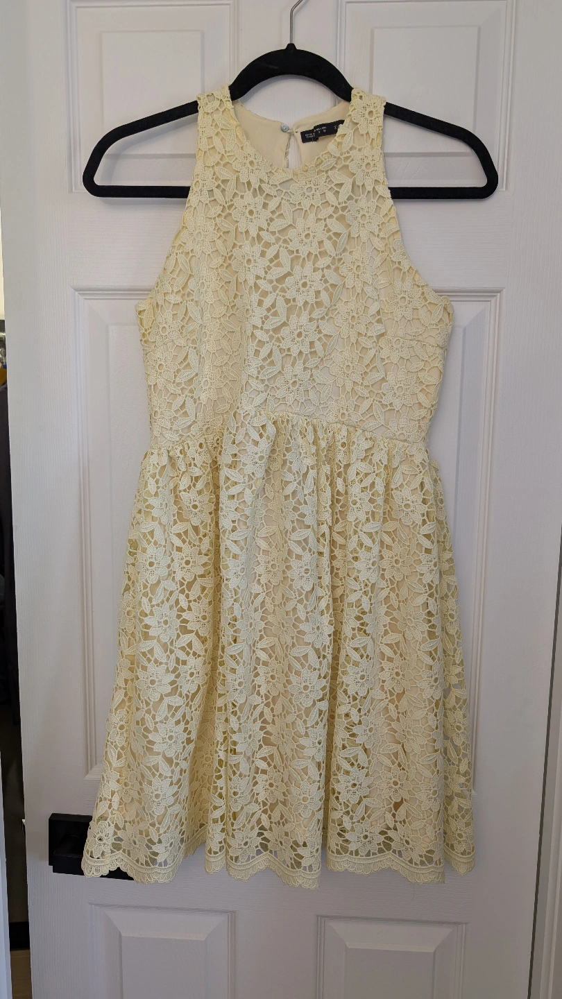 Beautiful pale yellow lace dress. Fit and flare silhouette. Sleeveless. Round neckline. Keyhole back. Perfect for spring or summer.