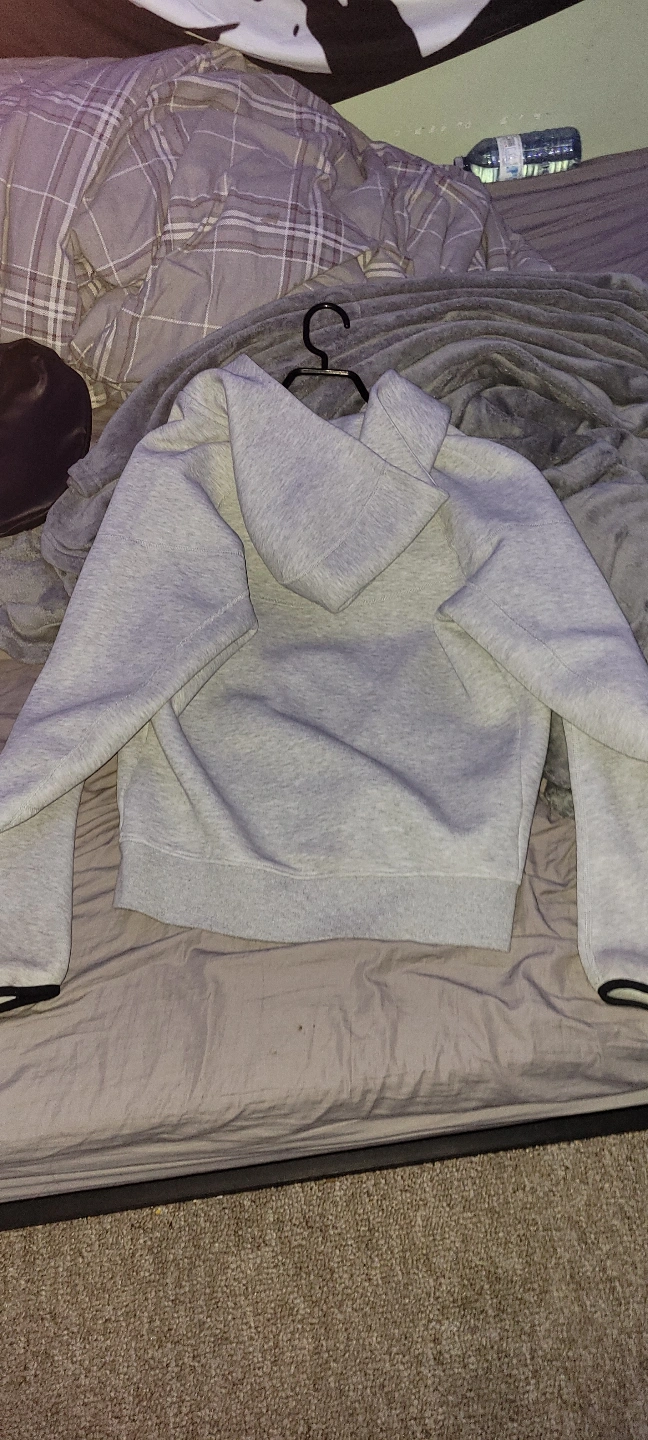 Grey Nike Tech Fleece zip-up hoodie. Features a full zip closure, kangaroo pocket, and Nike branding. Excellent condition.