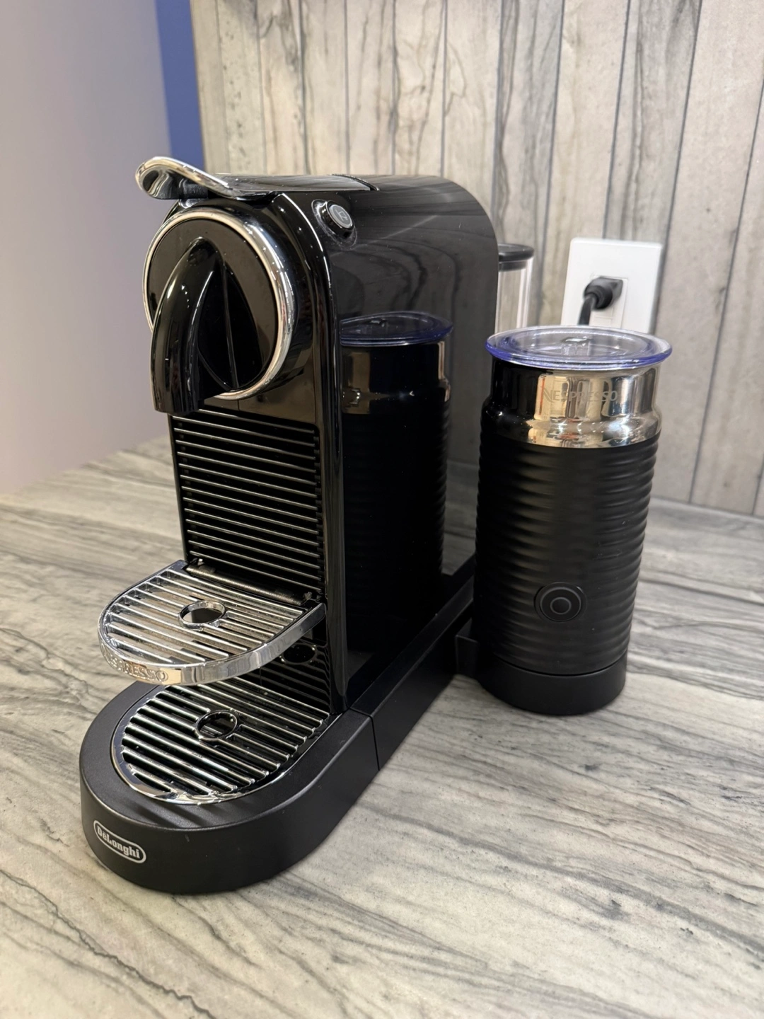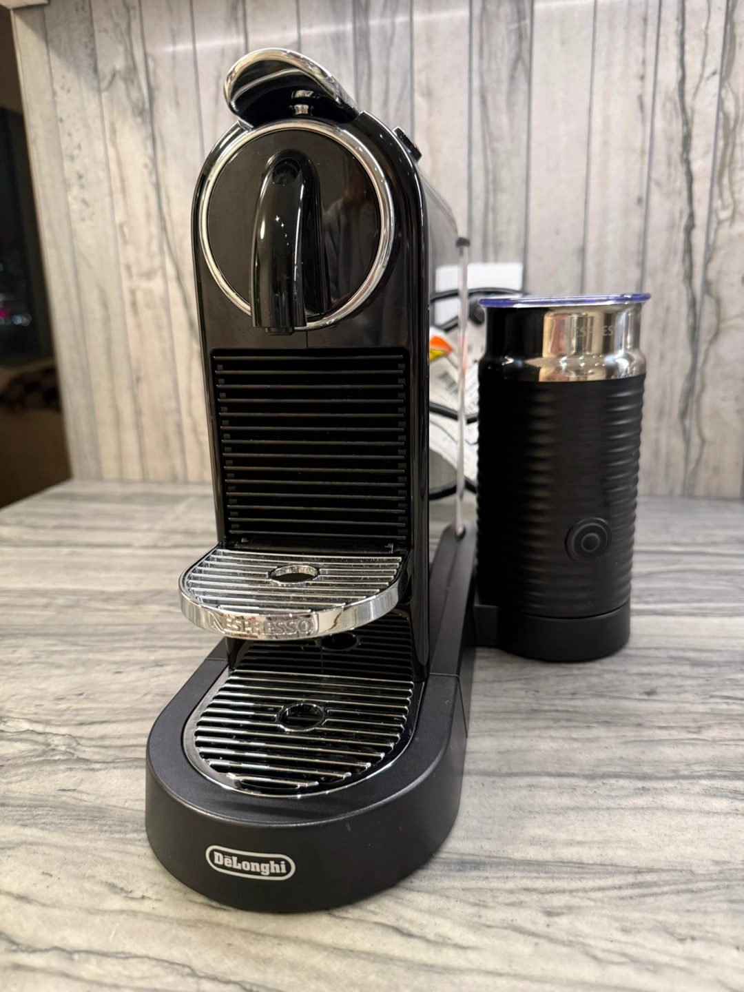 Elevate your coffee game with this sleek Nespresso CitiZ Coffee and Espresso Machine by De’Longhi, featuring an integrated Aeroccino milk frother. This is the Black Limousine edition — compact, stylish, and perfect for any countertop.