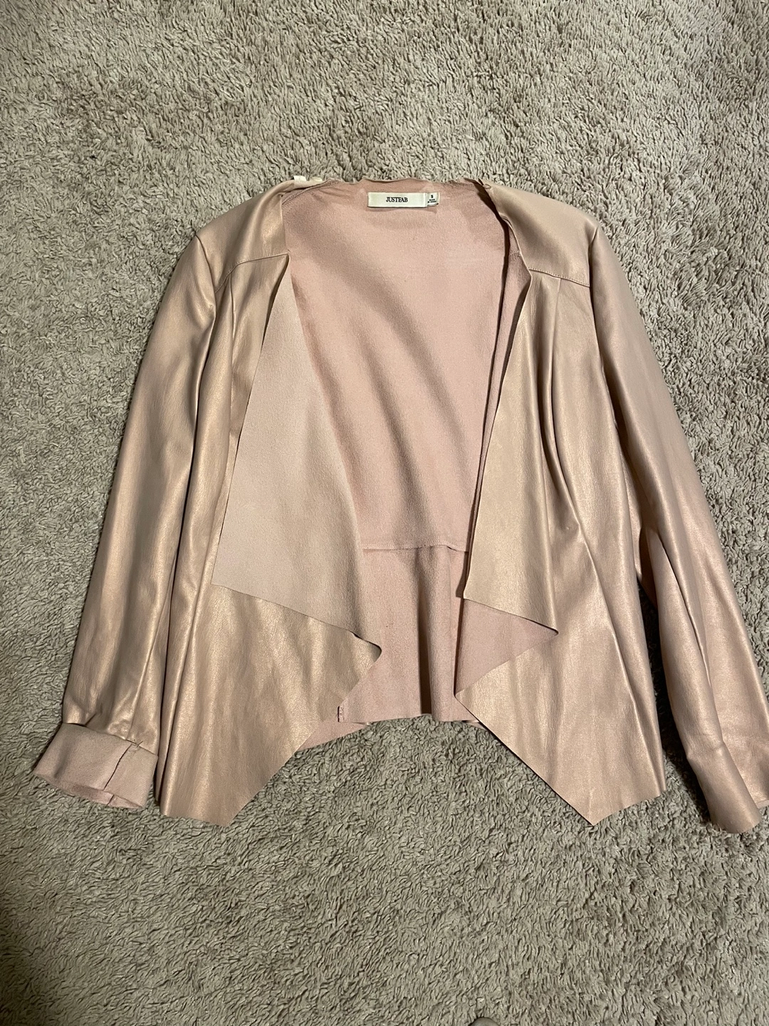 Lightweight blush pink open front blazer. Long sleeves. Asymmetrical hem. Soft material. Some minor wear on back neck