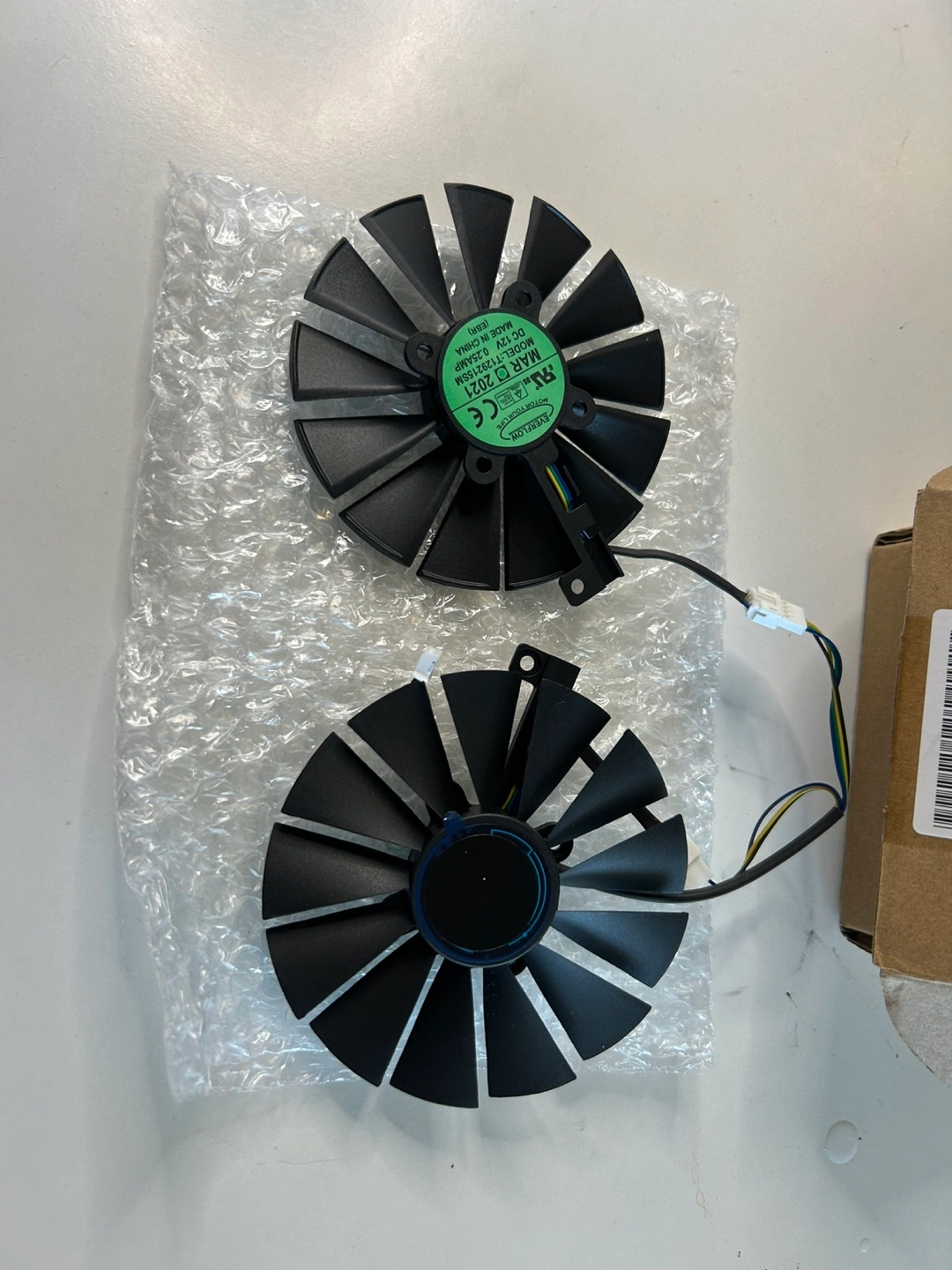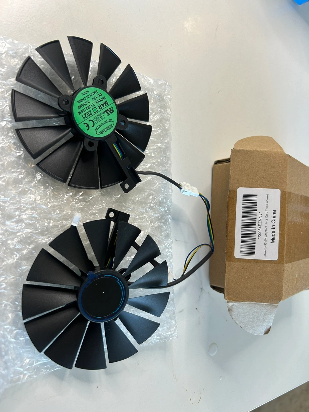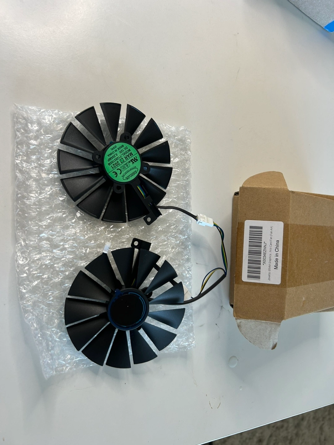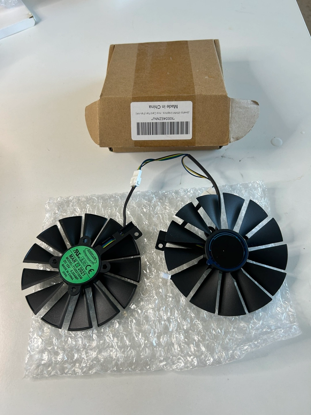 34Two black graphics card fans. Includes wiring. New, in original packaging. Made in China.