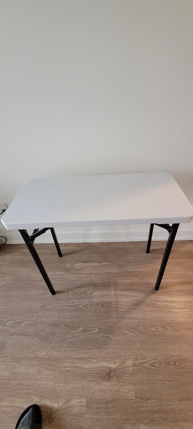 Portable folding table. White top, black legs. Measures approximately 3 feet long by 2 feet wide. Great for small spaces or events.
