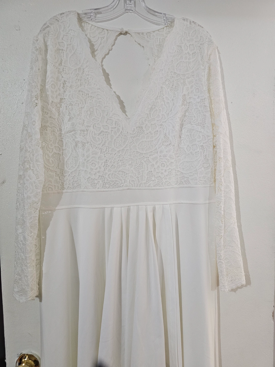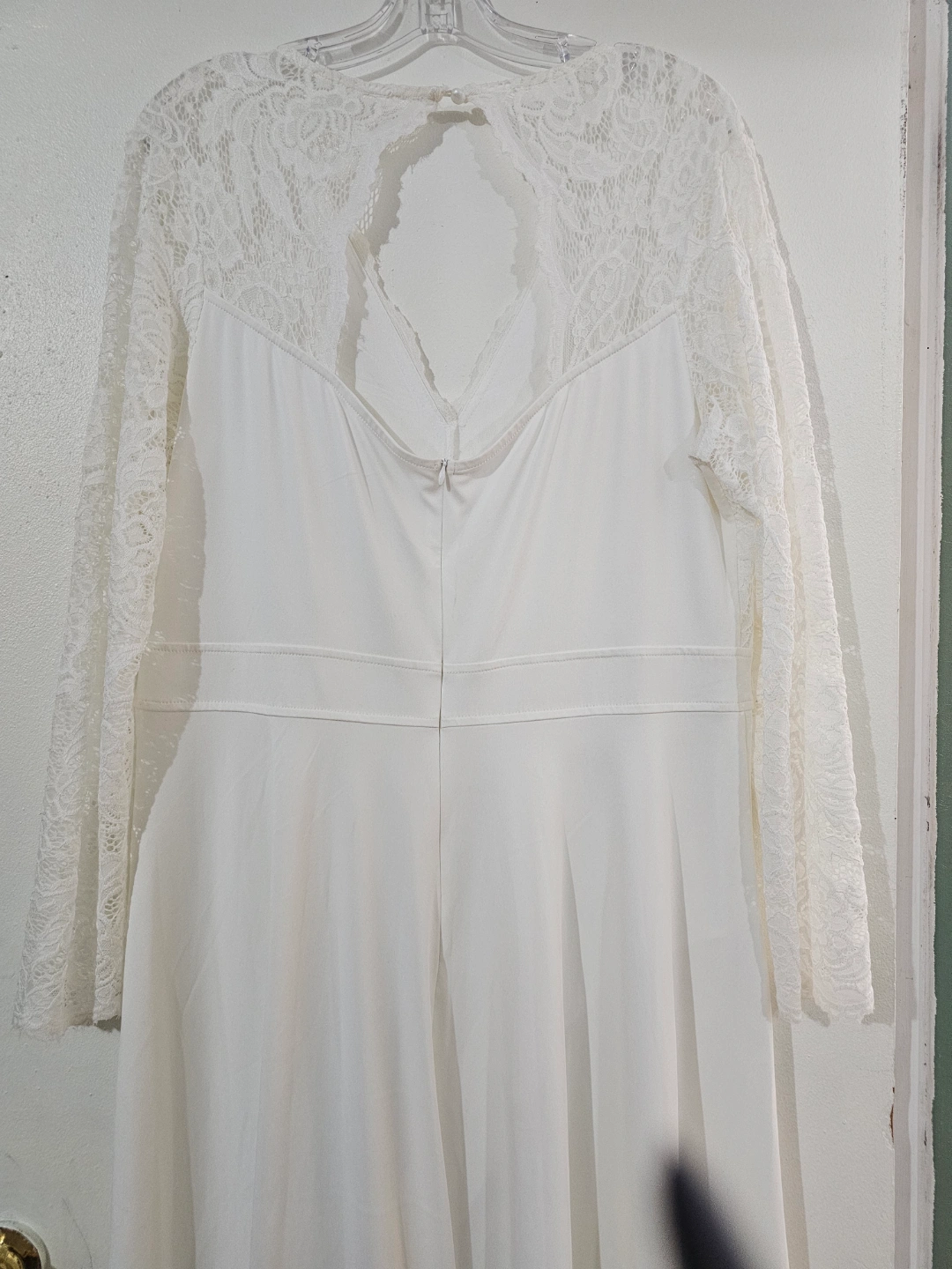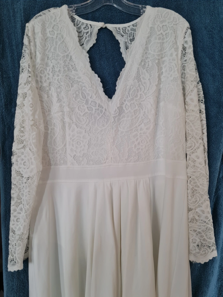 Beautiful white dress. Features a lace bodice and a high-low skirt. long sleeves. V-neckline. Open back detail. Perfect for a wedding or other special occasion.