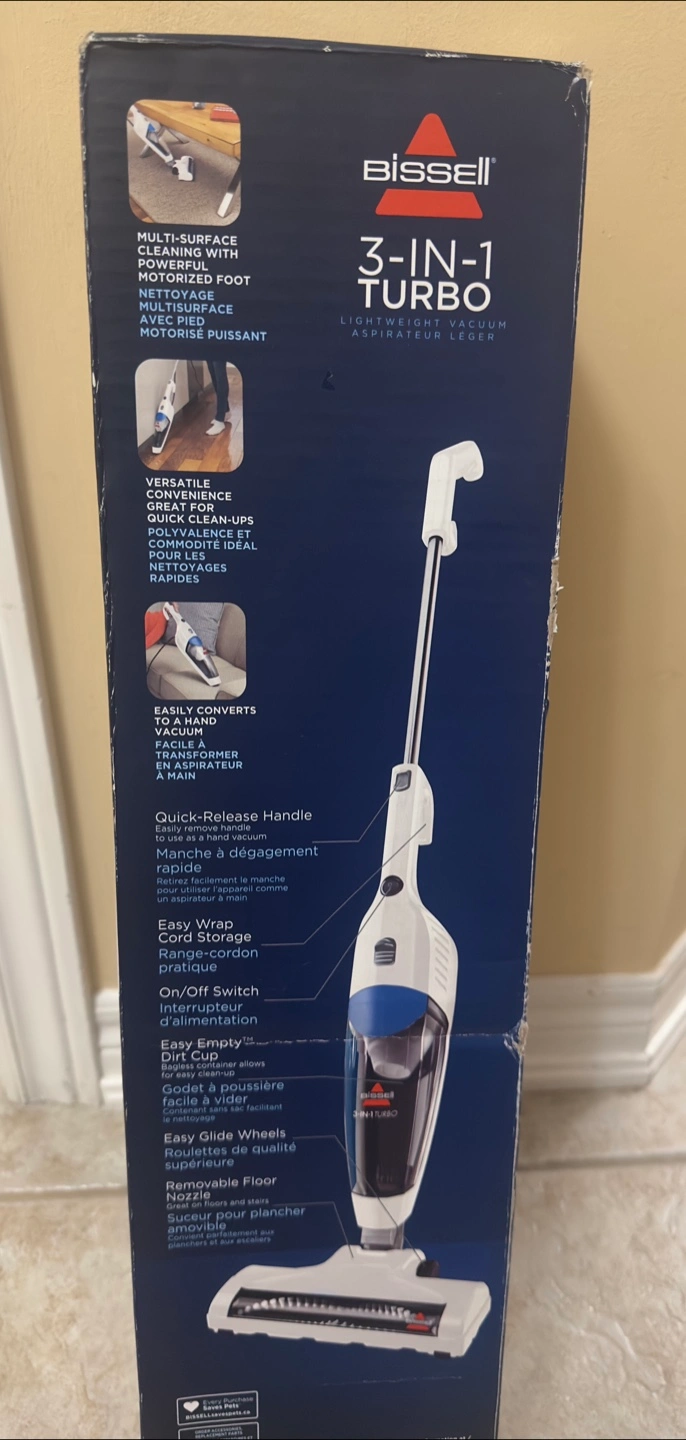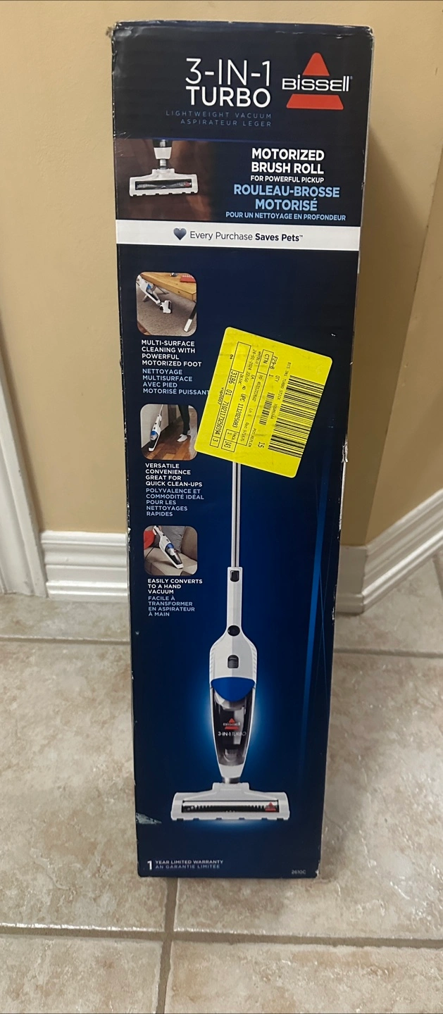 100Mississauga, Brandnew BISSELL 3-in-1 Turbo Lightweight Stick Vacuum $70 firm Powerful suction works great for quick pickups on multiple surfaces, including carpet, bare floors, stairs and upholstery 15-foot power cord allows for whole-room cleaning