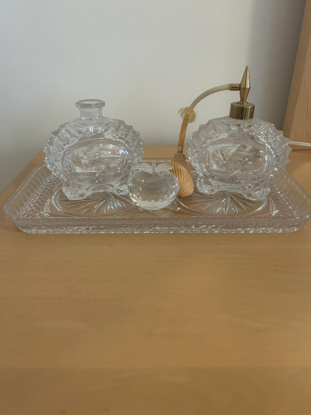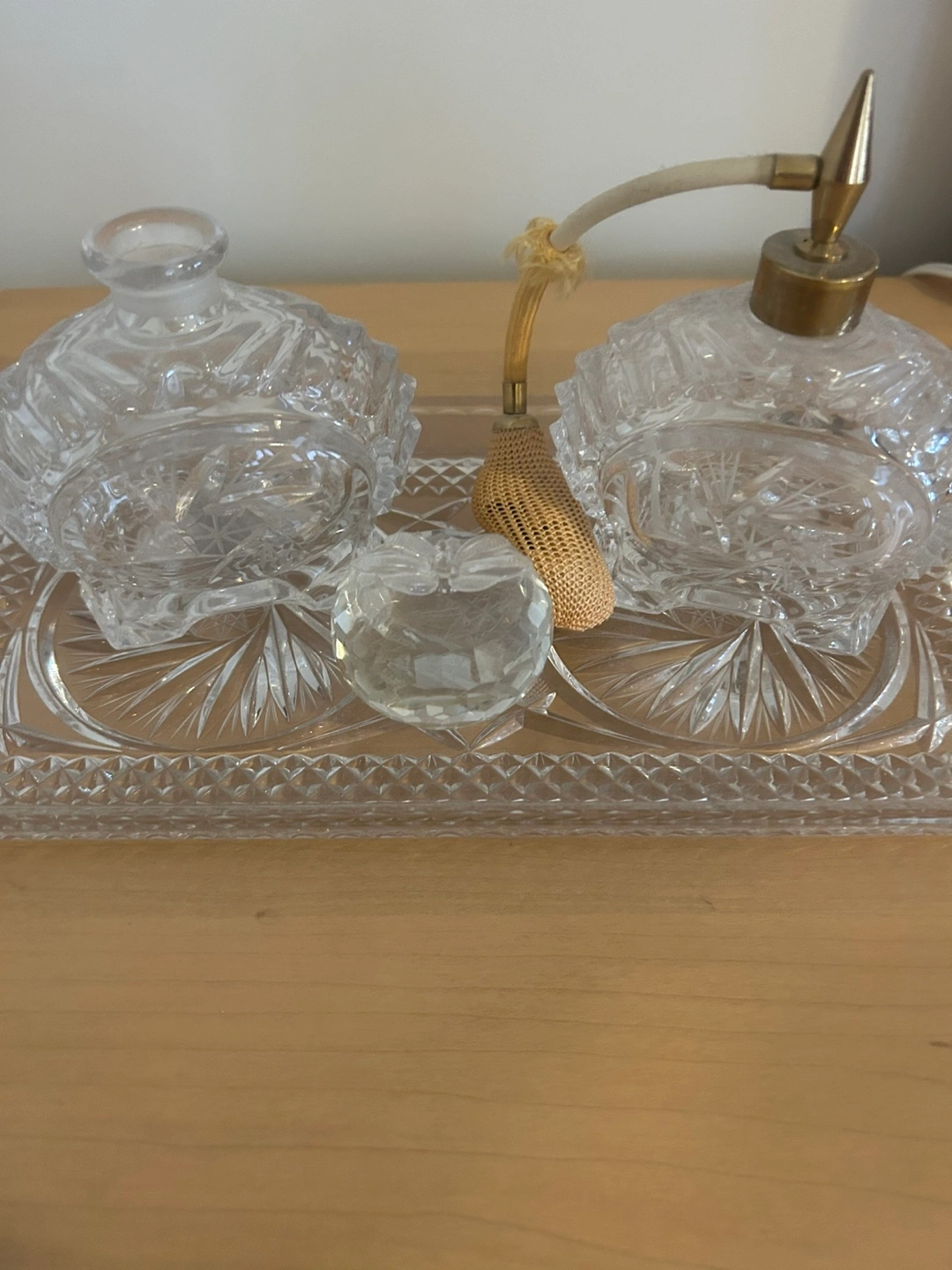 Beautiful vintage crystal perfume bottles and atomizer. Cut glass design. Includes a matching tray and small crystal accessory. Elegant and collectible. Make your vanity stand out!