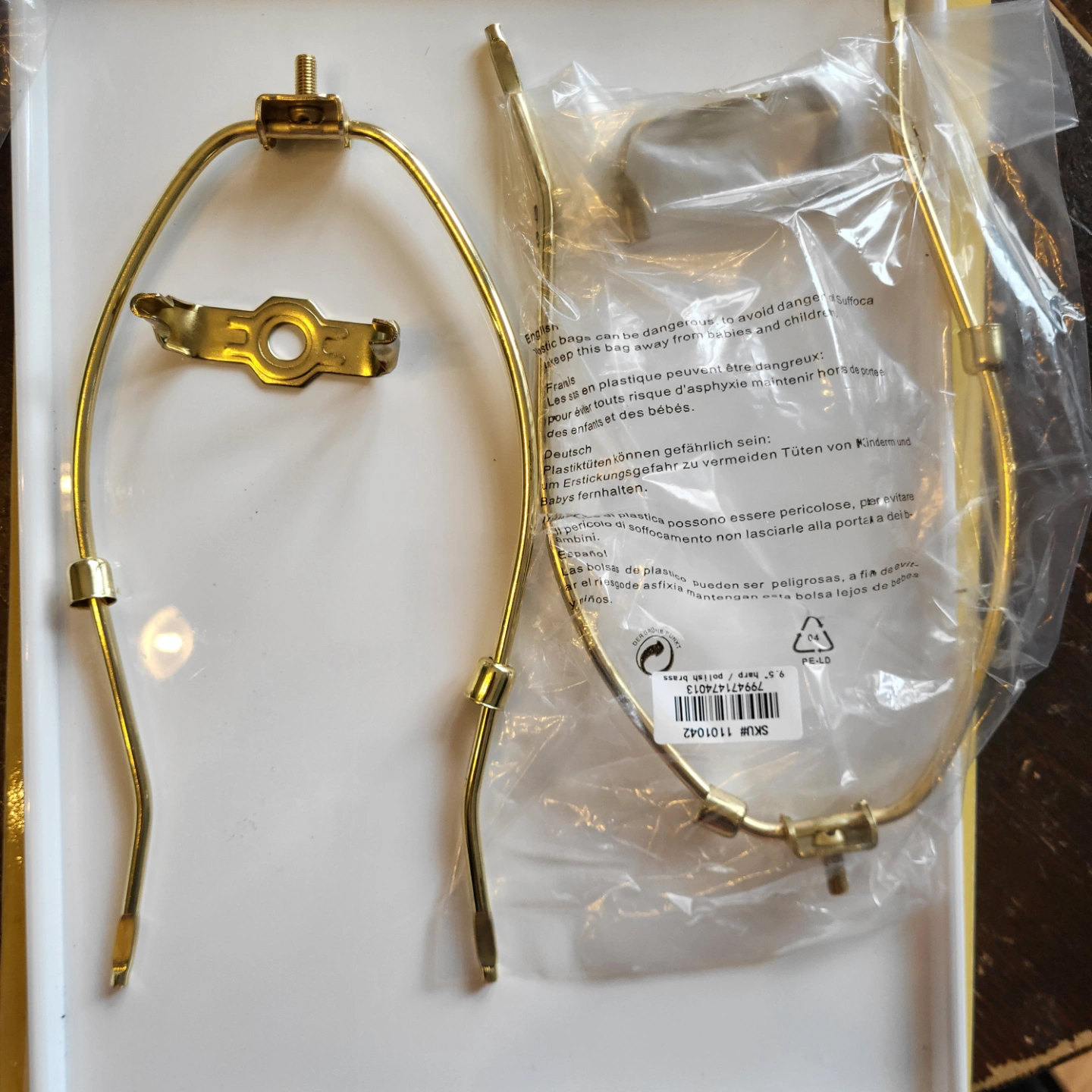 New lamp harp. Gold-tone finish. Suitable for table or floor lamps. Includes all necessary hardware. 9.5 inches from Mayfair.com. price for the pair of them. unused. one opened one still sealed