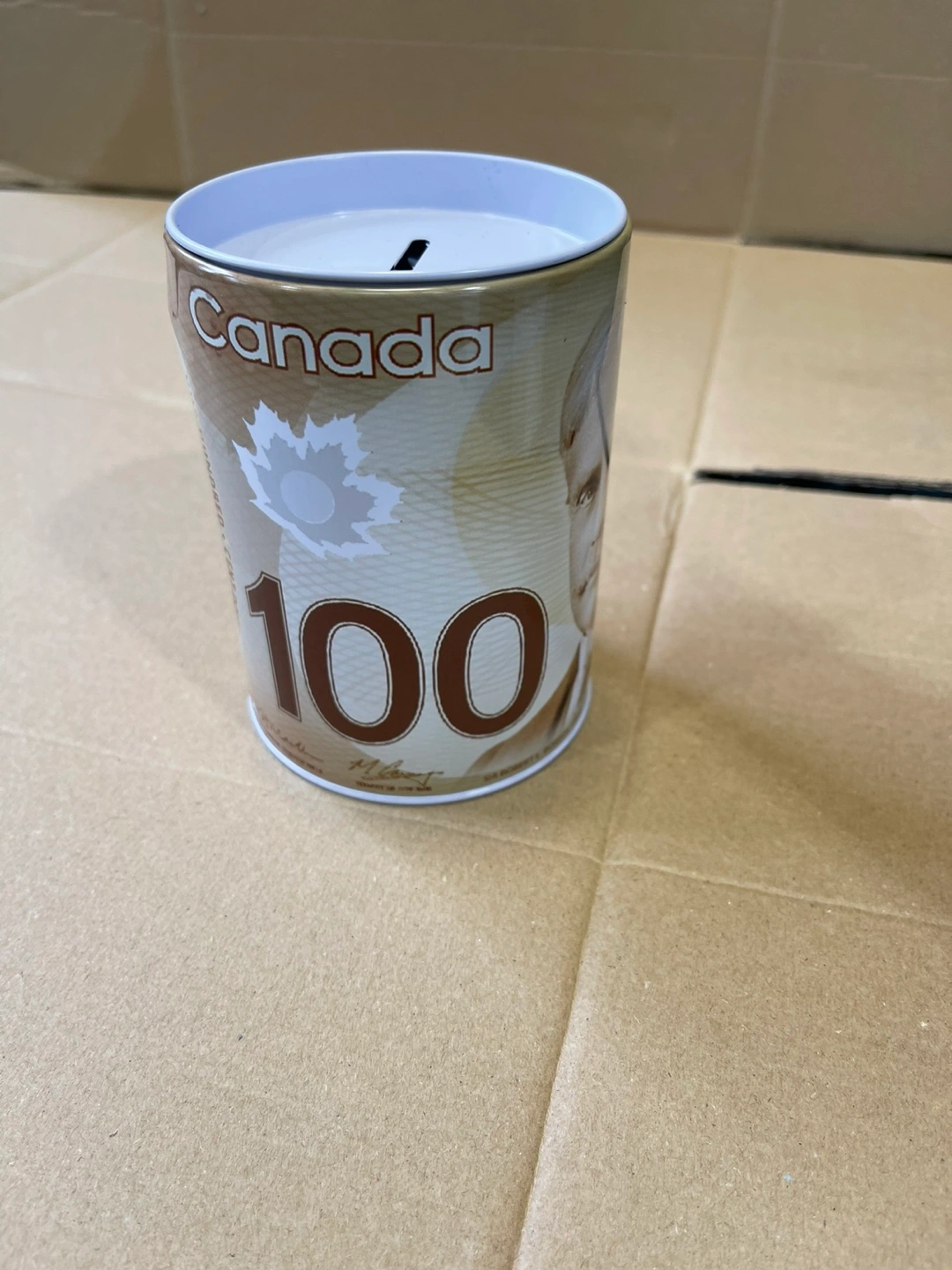 Metal coin bank. Features a design resembling a Canadian $100 bill. Cylinder shape with a slot at the top. Great for saving money.
